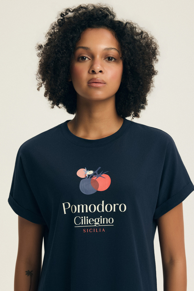 Предната част е украсена с принт с домат, който придава свеж, модерен и леко закачлив акцент, без да натоварва визията. Това е нощница, която можете да носите не само за сън, но и като удобен домашен тоалет за спокойни сутрини и вечери.