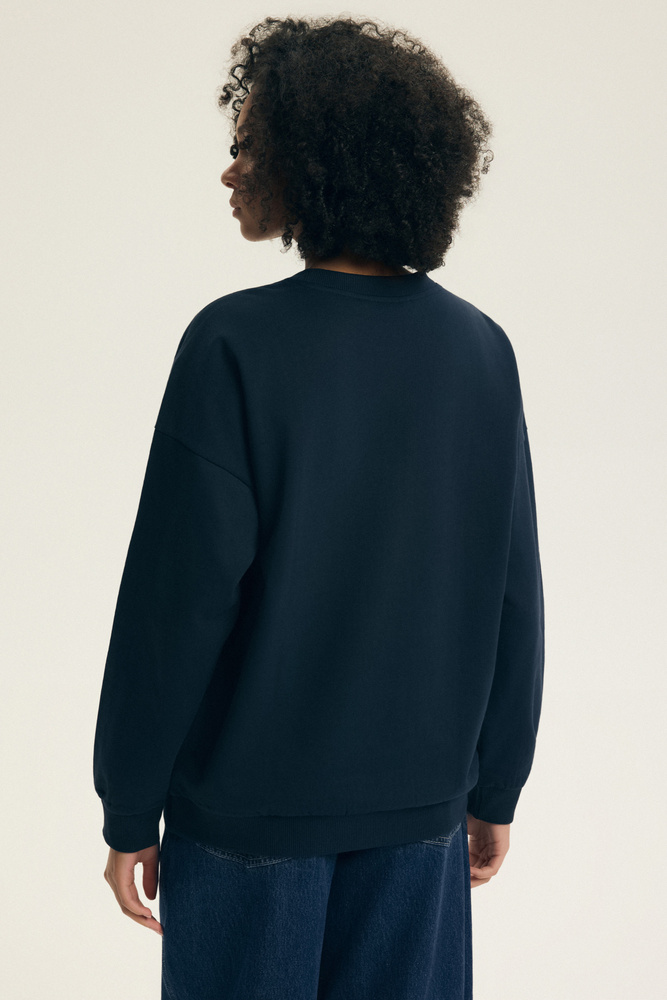 Блузата е изработена от висококачествена памучна материя с добавка на полиестер (77% памук, 23% полиестер), което осигурява мекота, добра въздухопропускливост и по-добра устойчивост при пране. Вътрешната страна е леко подплатена и създава комфорт в по-хладни сутрини и вечери, както и през есенно-зимния сезон. Класическата кройка с дълъг ръкав и обло деколте не ограничава движенията, а ластичните рипсени елементи на деколтето, маншетите и подгъва спомагат за добро прилягане към тялото.