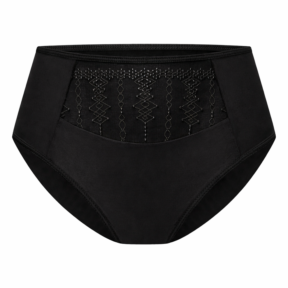 Предната част на бикините е изработена от гладка, еластична материя, която меко следва формата на тялото и не се отбелязва под прилепнали дрехи. Горната зона е украсена с фина бродерия, стилистично съчетана с дизайна на сутиена от същата серия, което придава женствен и елегантен вид. Страничните и задните части осигуряват лекота и свобода на движение, така че бикините остават комфортни през целия ден.