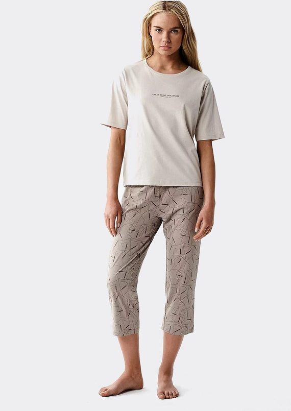 Горната част е с къс ръкав и класическо обло деколте, което не притиска и стои естествено по тялото. Деликатният надпис отпред добавя модерен акцент, без да натоварва визията. Долнището е с дължина 3/4 и е изработено от мека памучна материя с десен. Удобните странични джобове на нивото на ханша правят тази дамска пижама практична и като домашен комплект за свободното време.