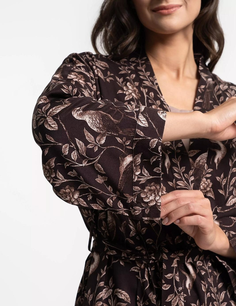 Халатът е изработен от 100% вискоза – материя, която се отличава с гладка текстура, лекота и отлична дишаемост. Платът пада свободно по тялото и създава естествен силует, без да утежнява фигурата. Коланът в талията позволява индивидуално регулиране според формите, а практичните странични джобове добавят функционалност в ежедневието. Флоралният принт в топъл нюанс капучино придава женствен и завършен вид.