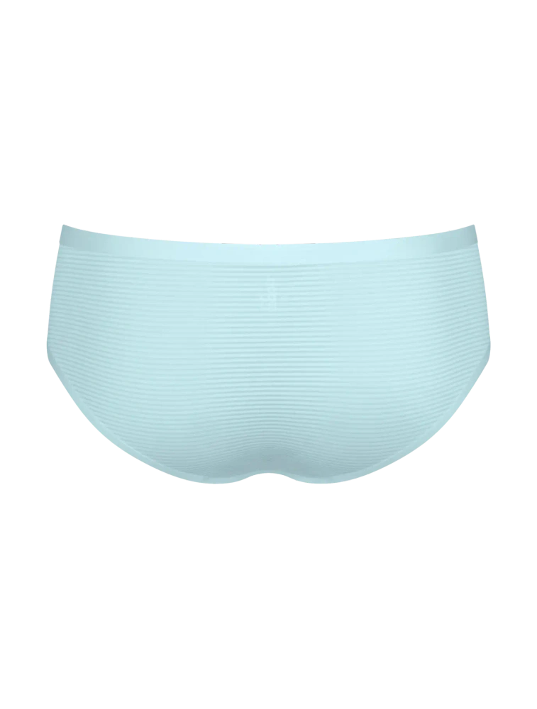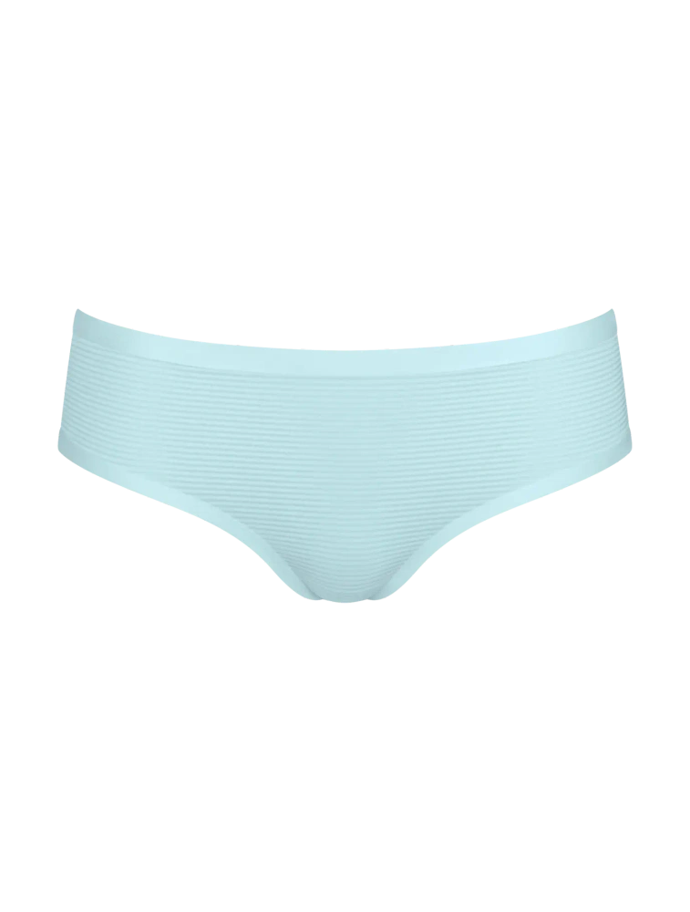 Кройката hipster със средна талия обгръща нежно ханша и стои стабилно без пристягане. Моделът е изработен от рециклиран полиамид с GRS сертификат (89% полиамид, 11% еластан). Материята с 360° разтегливост се адаптира към формата на тялото и възстановява първоначалния си вид след пране. Благодарение на иновативната технология на точково свързване, краищата са гладки и безшевни, което прави бикините напълно невидими под тесни дрехи.