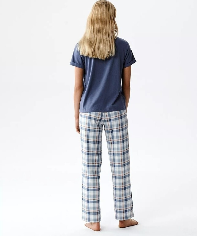 Долната част включва шарени панталони с удобна кройка, които гарантират комфорт по време на сън. На нивото на ханша са разположени практични джобове, които добавят функционалност към модела. Еластичната талия осигурява добро прилепване и удобство при носене.