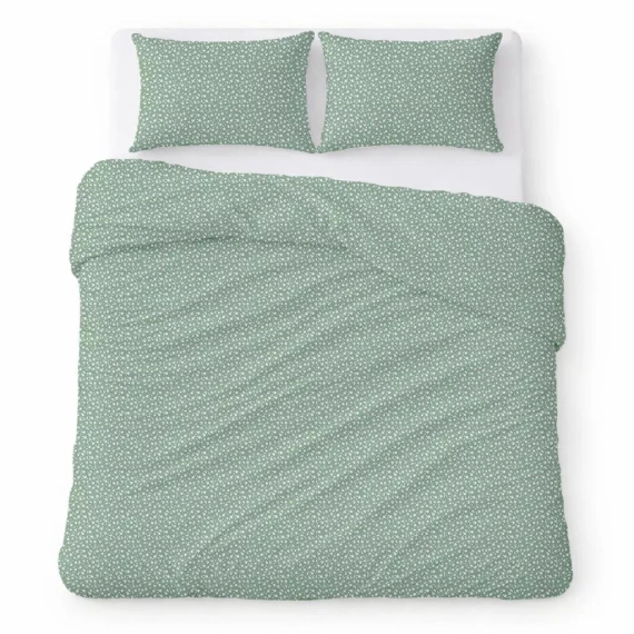 Комплектът включва плик за завивка и калъфки за възглавници, създавайки функционален набор за леглото. Пликът за завивка е със закопчаване с копчета, което улеснява поставянето и поддържа завивката на място.
