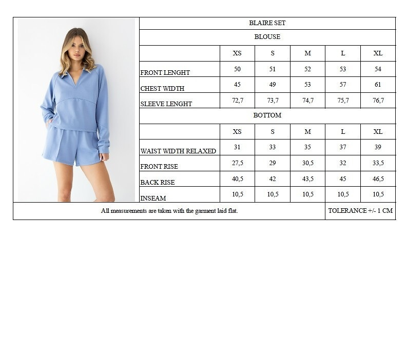 - Стилен дамски комплект Sensis Blaire в модерен син нюанс denim blue. Свободна блуза с яка тип polo и удобни къси панталони с висока талия създават комфортна визия за ежедневието, дома или летните разходки.