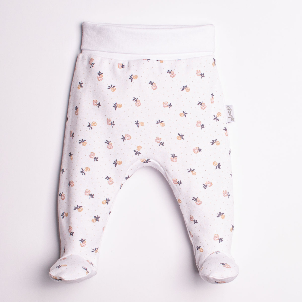 Нежният флорален принт придава красив и универсален вид. Ританките лесно се комбинират с бебешко боди, жилетка или блузка и създават удобен комплект за новородено. Подходящи са както за сън, така и за ежедневна употреба у дома или по време на разходка.
