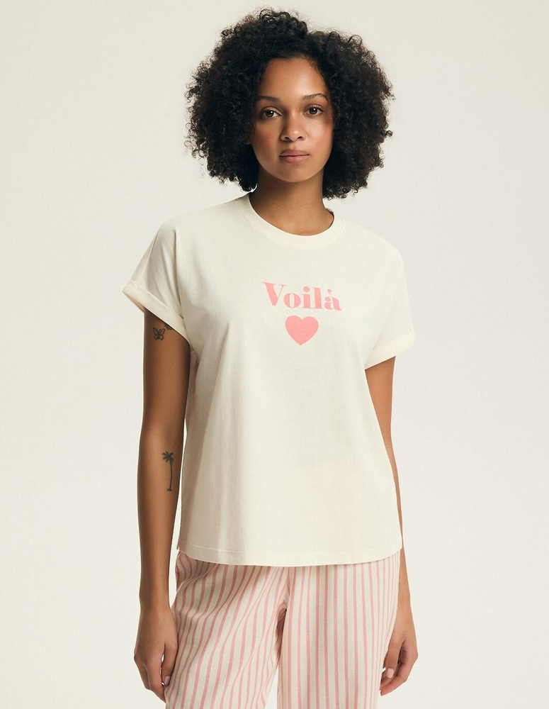 Горната част е тениска с къс ръкав с маншет и полукръгло деколте, което осигурява удобство при носене. На нивото на гърдите има цветен принт, който придава на комплекта модерен и женствен вид.