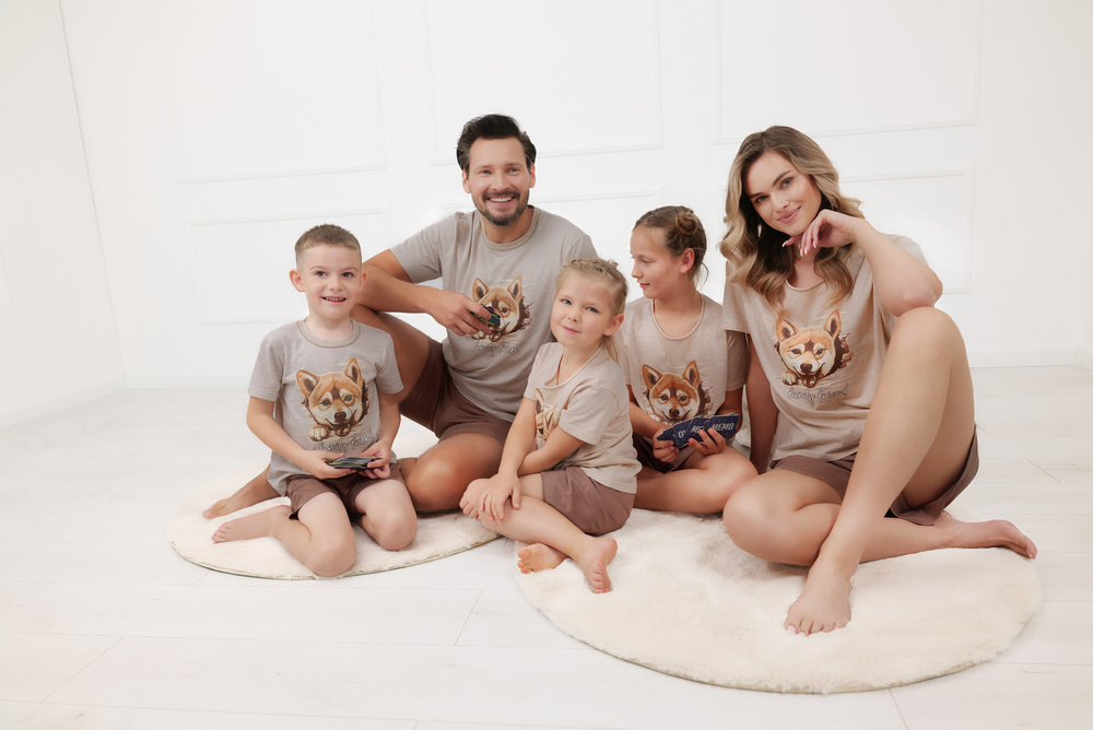 Тениската е с класическа кройка, къс ръкав и обло деколте. Не прилепва към тялото, което гарантира свобода на движение по време на сън и игра. Щампата с куче порода шиба и надпис „family friend“ придава весел и непринуден характер.