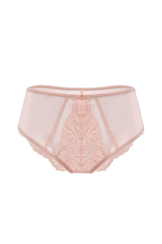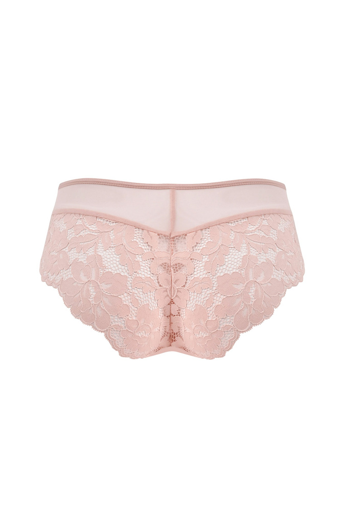 Моделът е изработен от фина прозрачна мрежа, която нежно обгръща тялото и се адаптира към формата му без да притиска. Предният панел от флорална дантела визуално оформя силуета и придава елегантен и женствен вид. Дантеленото завършване около крачолите осигурява гладко прилягане, благодарение на което бикините не се очертават под дрехите. Пудреният цвят добавя мек и романтичен акцент.