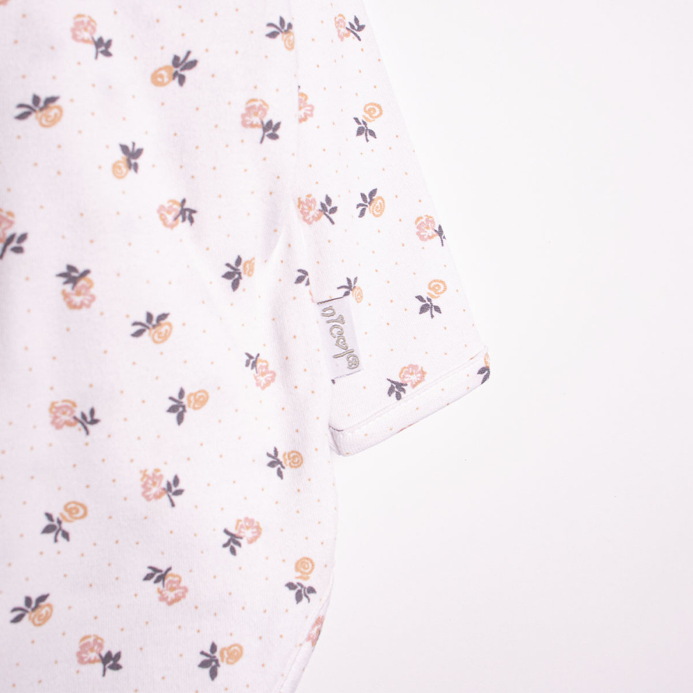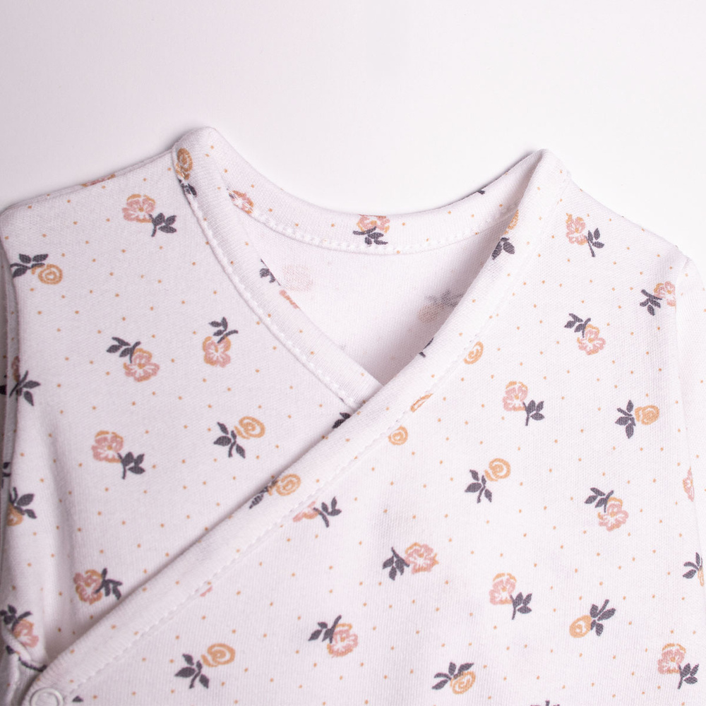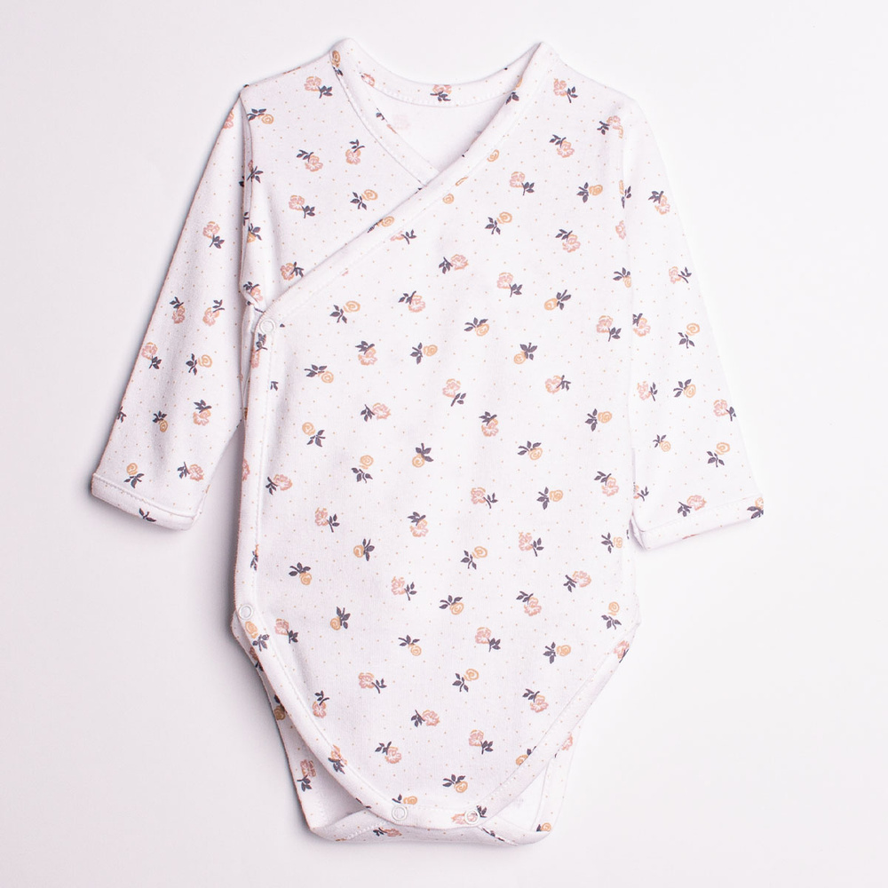 • Боди с дълъг ръкав за момиче, с цветен принт, изработено от мека памучна тъкан. Лесно се закопчава с безникелови копчета, осигуряващи комфорт и удобство. Идеално за новородени!