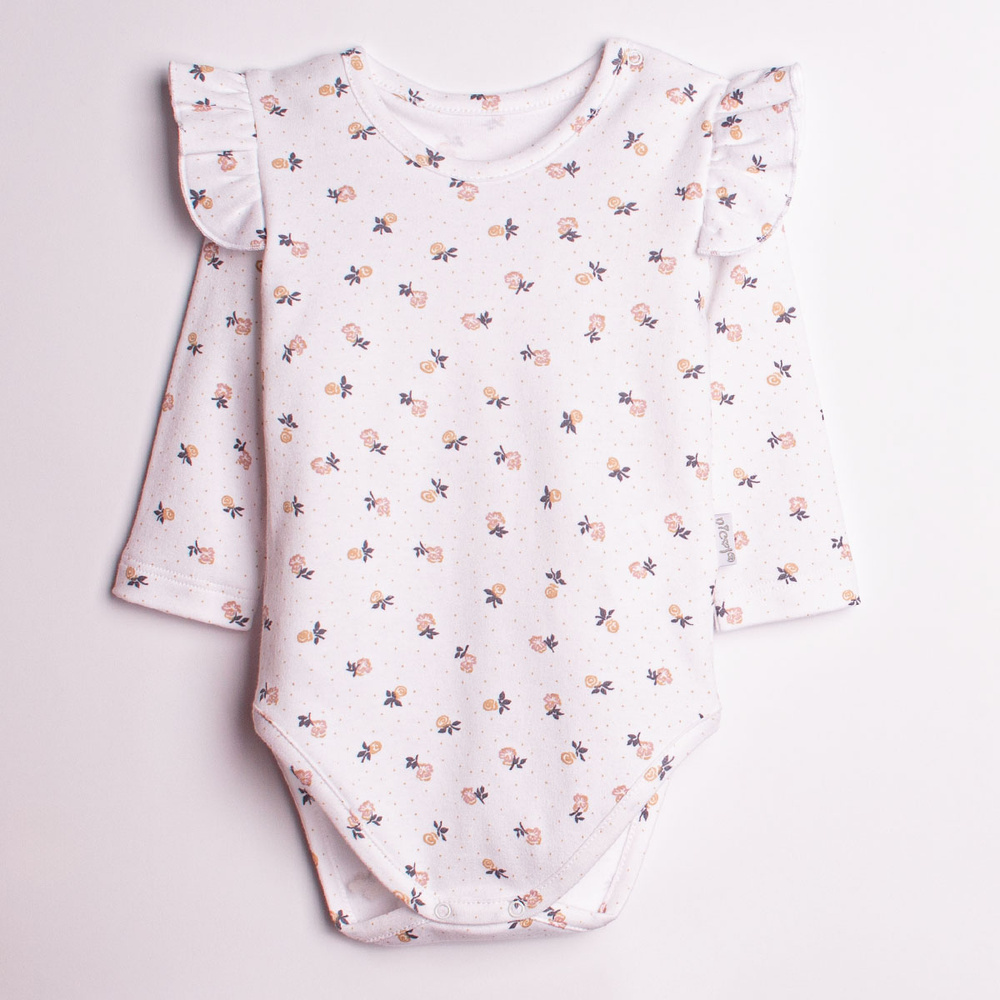 - Елегантно боди за момиче Nicol 220097 с дълъг ръкав, цветен принт и декоративни пеперуди на ръкавите. Идеално за всякакви поводи, удобно и безопасно благодарение на сертификата Oeko-Tex Standard 100.