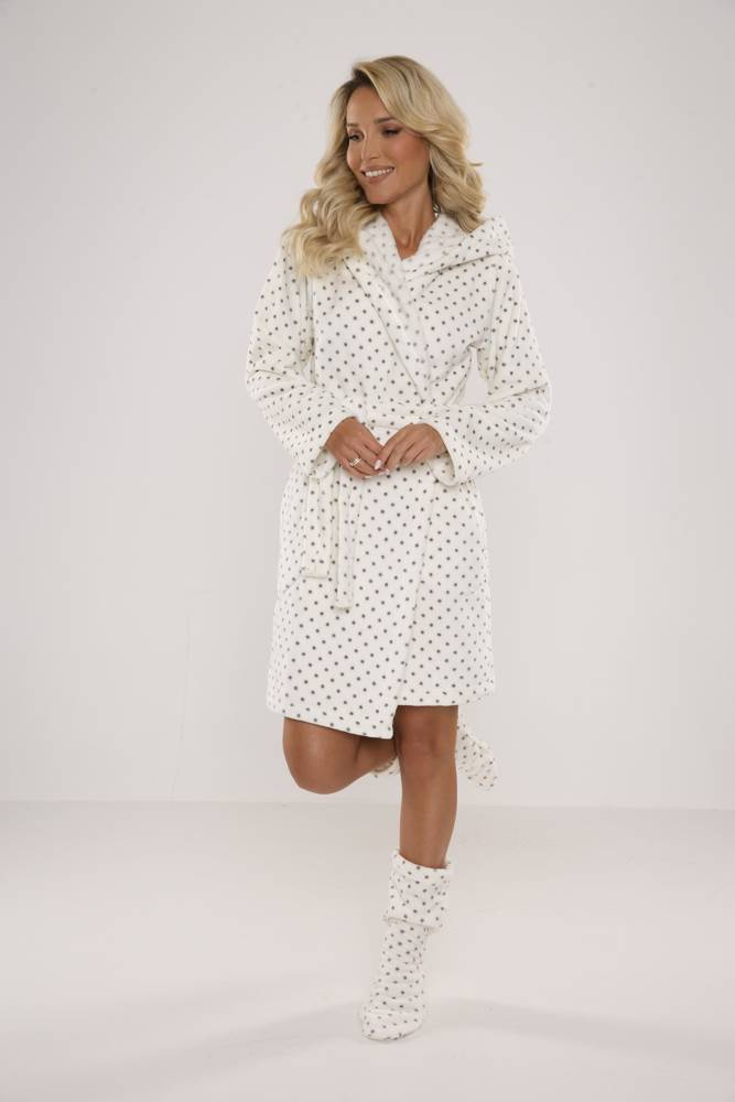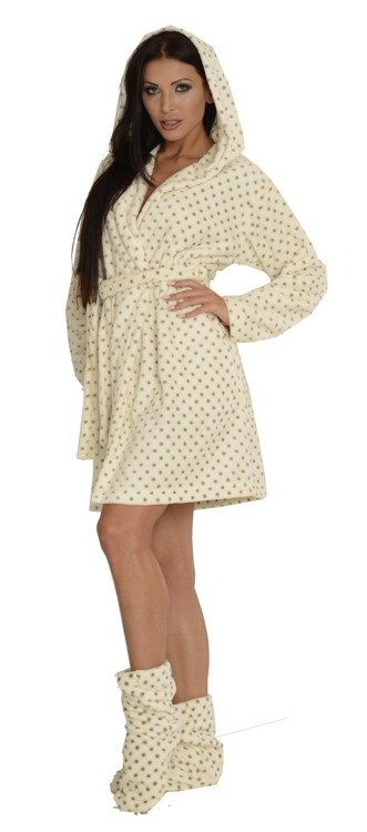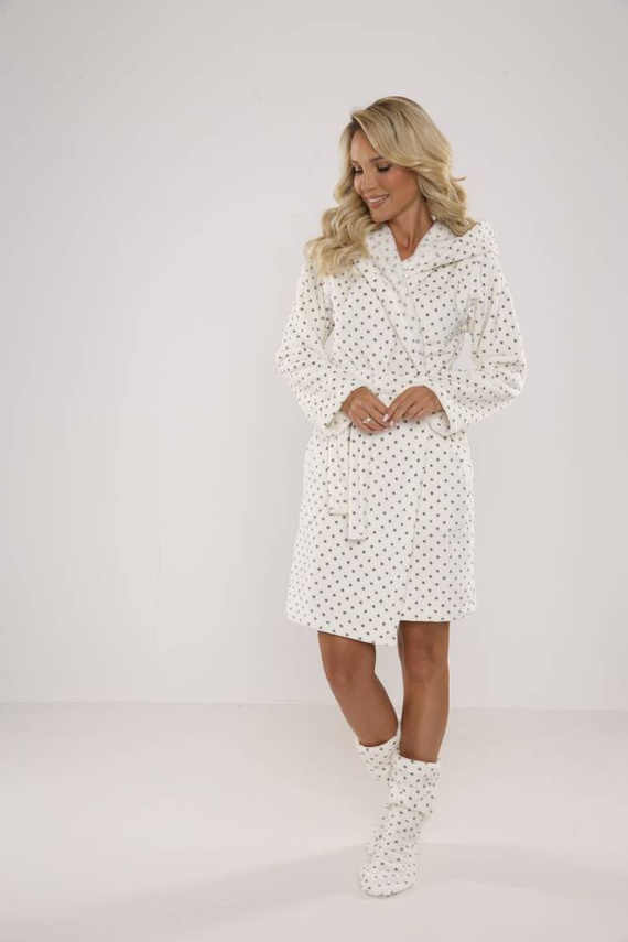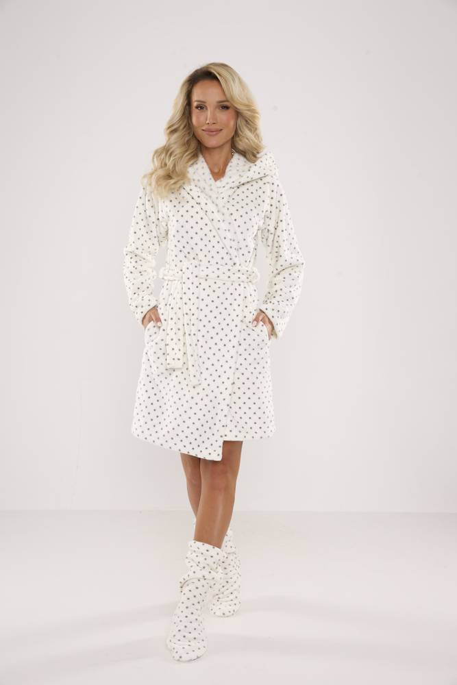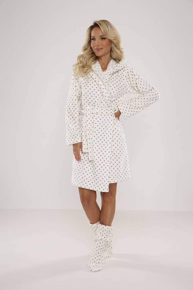 Дамски халат FOREX с права кройка и качулка. Дължина до коляното, странични джобове, колан с връзка. Всичко в грах. Халатът за баня се адаптира перфектно към формата на тялото, изключително мек и лек, изработен от мека трикотажна материя. Да се увиете в него след къпане е удоволствие!