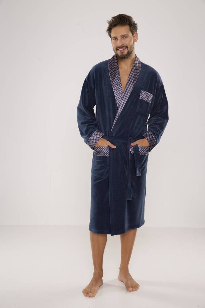 .Дълъг мъжки халат от велур, с яка с шал, връзка с колан, с два джоба и един по-малък джоб на нивото на гърдите. Маншети, яка и джобове, завършени с шарен сатен. Изработен е от 80% памук, приятен на допир и с перфектна абсорбция на вода.