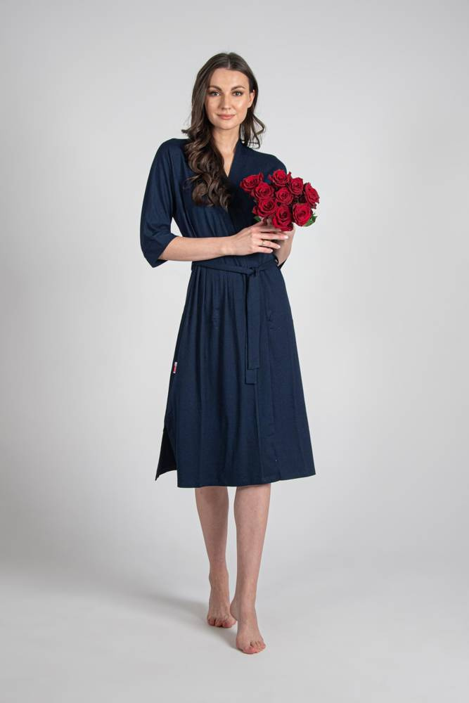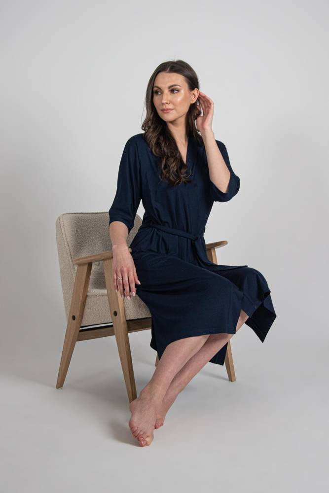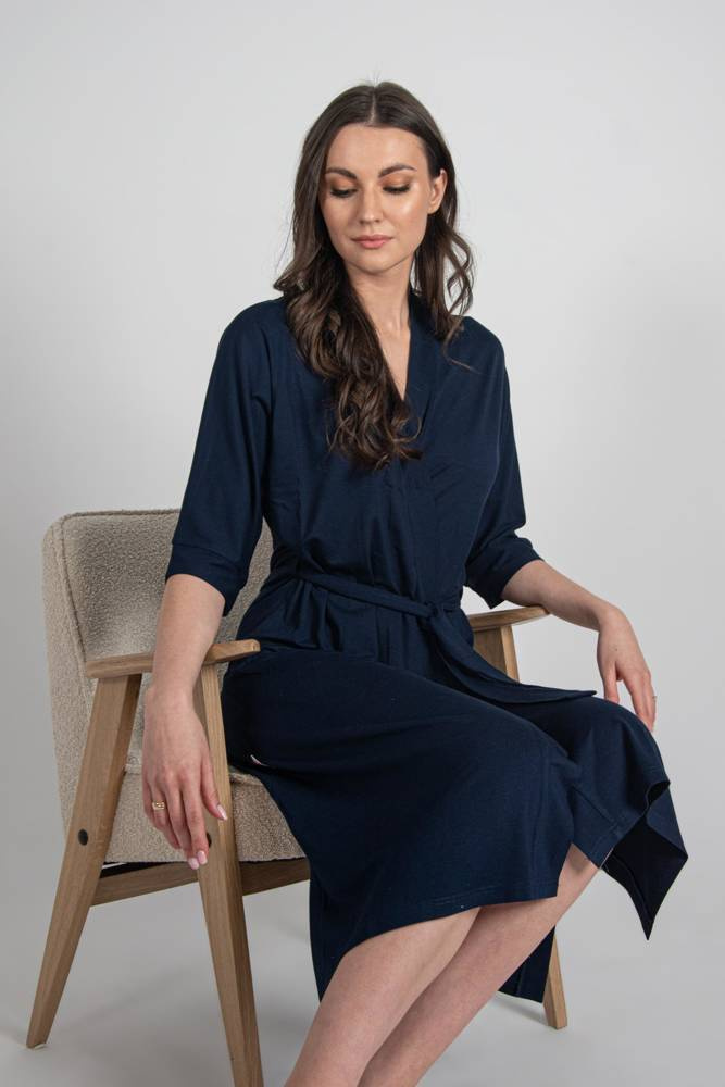 • Елегантен дамски халат 942 Visa на De Lafense, изработен от висококачествена вискоза. Дълга кройка, 3/4 ръкав и колан създават женствен и класически вид.