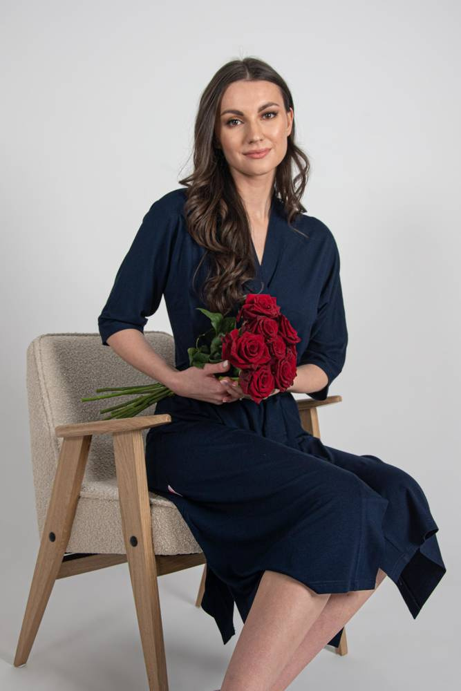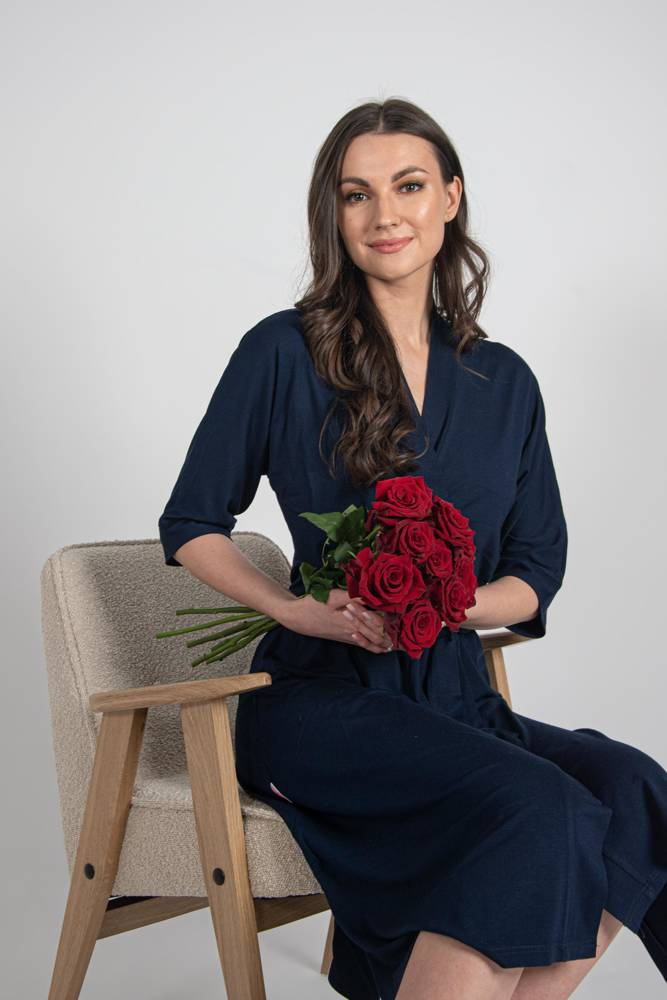 Моделът с по-дълга кройка обгръща перфектно тялото, а 3/4 ръкавите и връзката на талията подчертават талията, като придават лекота и женственост на цялостната визия.