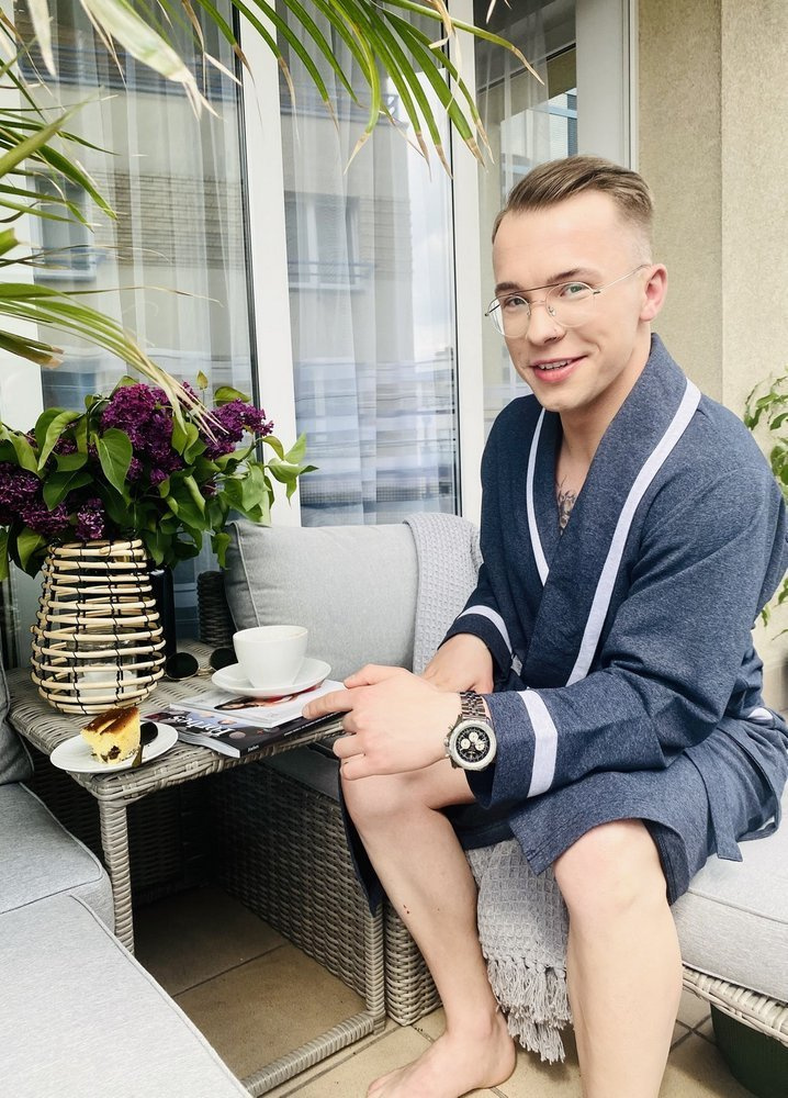Предлагаме ексклузивен дълъг халат за баня с яка, завързан на талията.