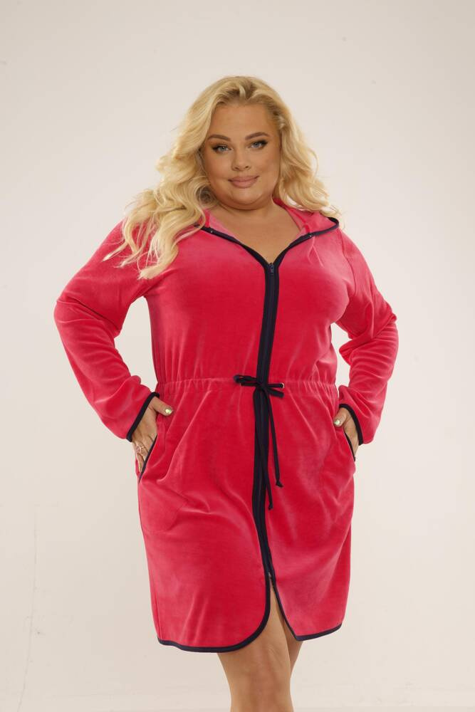 Дамски къс халат с качулка, закопчаване с цип. Изработен от велур. Регулируеми презрамки на талията. Халатът за баня се адаптира перфектно към формата на тялото, изключително мек и лек е. Да се увиете в него след къпане е удоволствие!