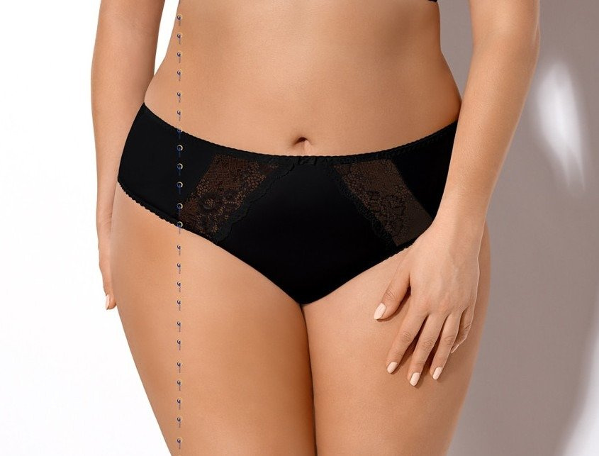 Класически дамски бикини, леко повдигнати в областта на бедрата. Изработен от фин микрофибър. Декорирана отпред с флорални дантелени вложки.