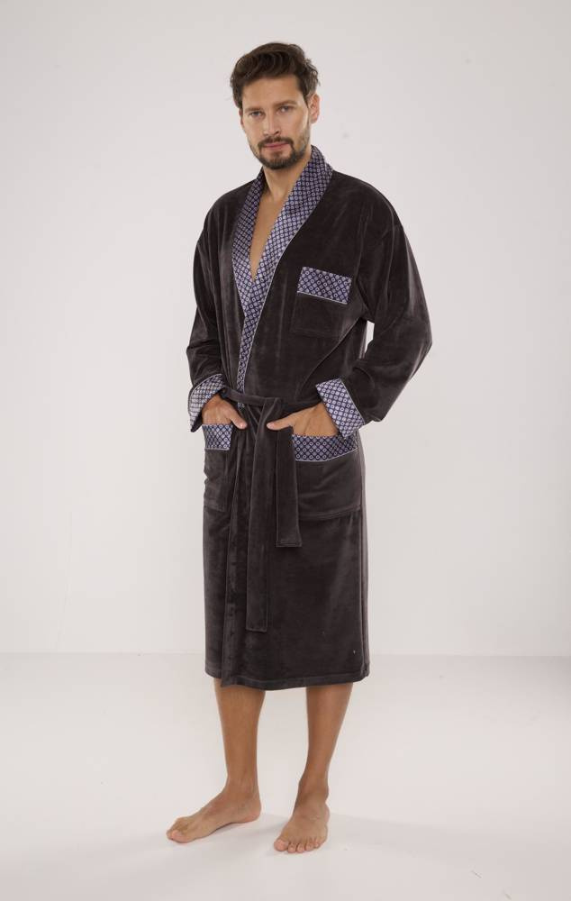 .Дълъг мъжки халат от велур, с яка с шал, връзка с колан, с два джоба и един по-малък джоб на нивото на гърдите. Маншети, яка и джобове, завършени с шарен сатен. Изработен е от 80% памук, приятен на допир и с перфектна абсорбция на вода.