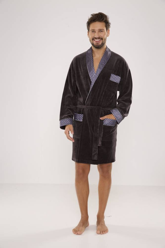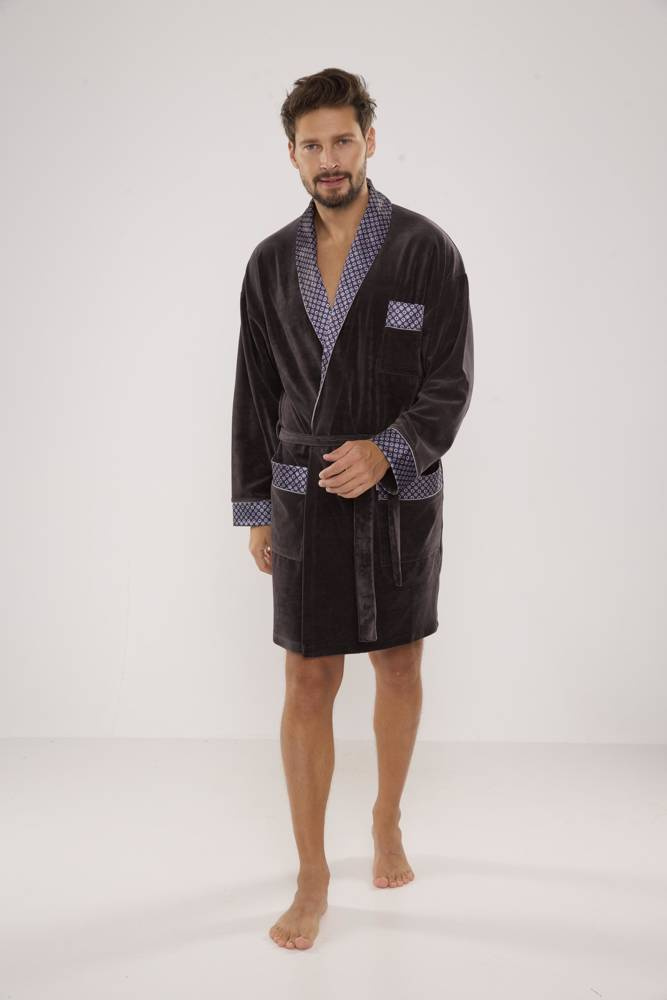 Мъжки къс велурен халат, с яка с шал, завързан на кръста, с два джоба и един по-малък джоб на гърдите. Маншети, яка и джобове, завършени с шарен сатен. Изработен е от 80% памук, приятен на допир и с перфектна абсорбция на вода.