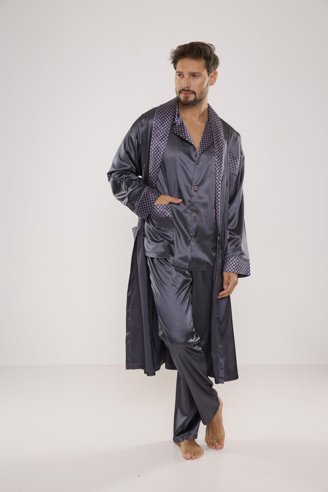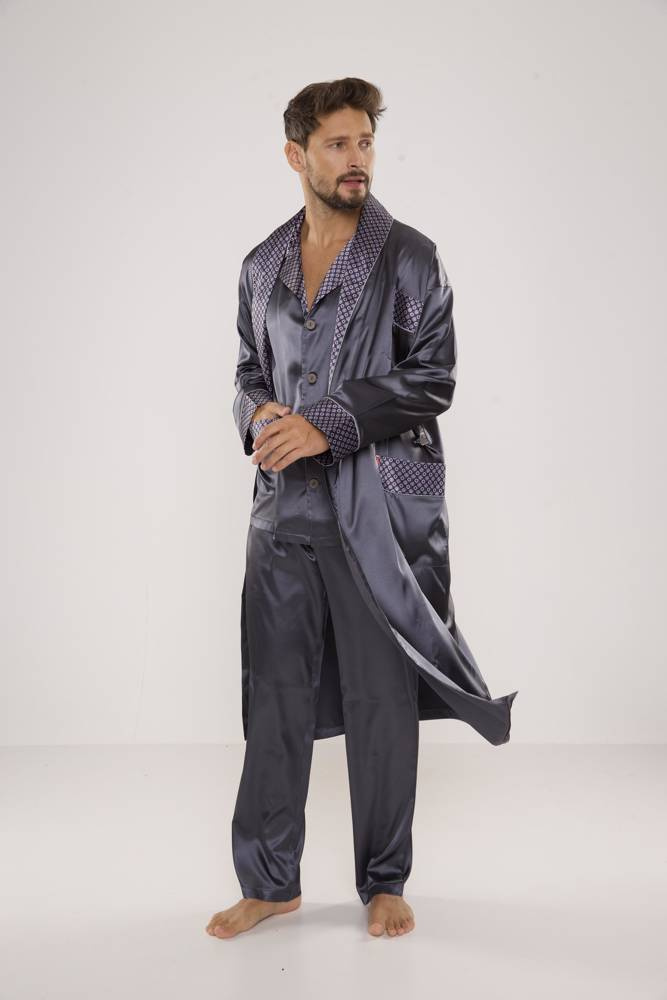 Елегантна мъжка пижама, дълга, разкопчана, с яка и джобове.