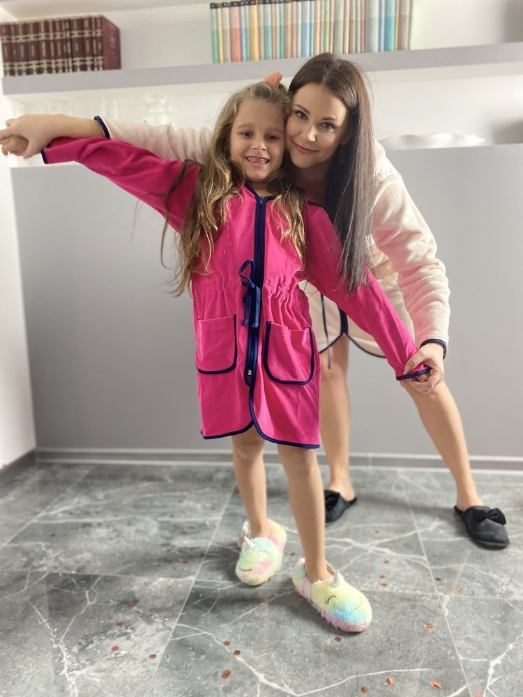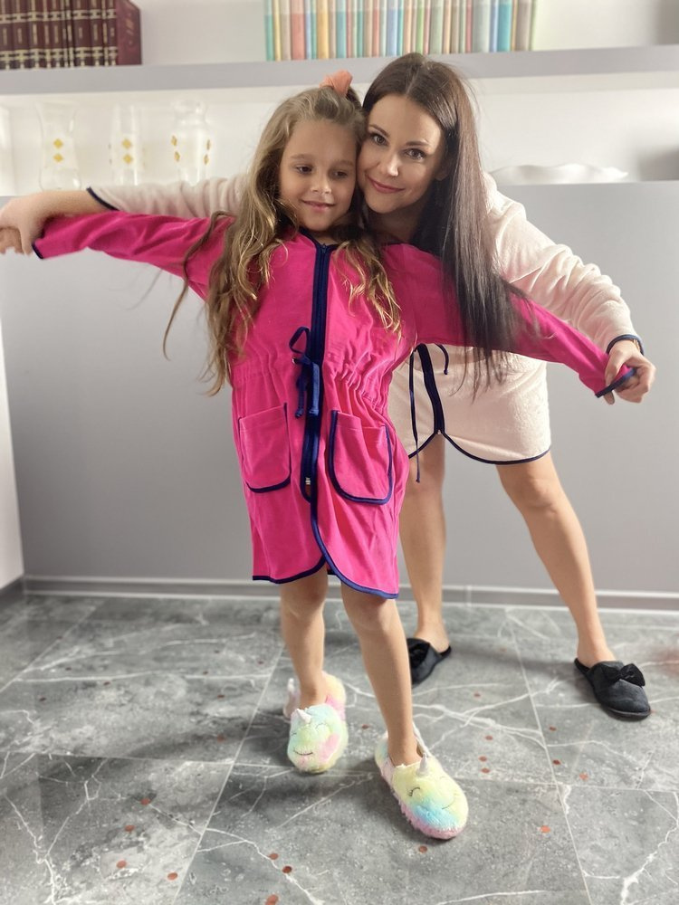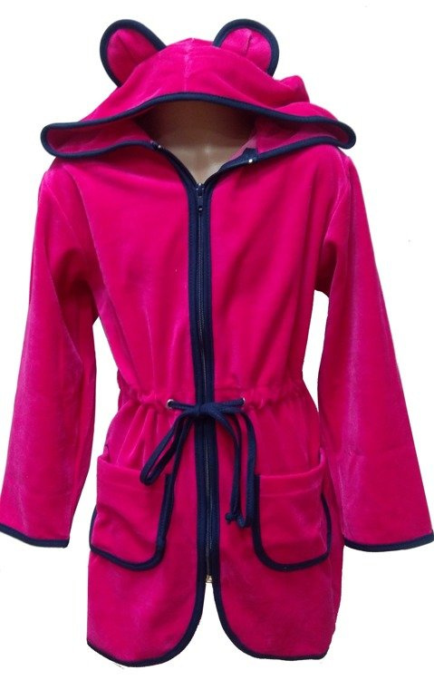 Къс халат за обличане детско яке с качулка и цип. Изработен от велур. Регулируеми презрамки на талията. Модел, украсен с уши на качулката. Халатът за баня се адаптира перфектно към формата на тялото, изключително мек и лек е. Да се увиете в него след къпане е удоволствие!