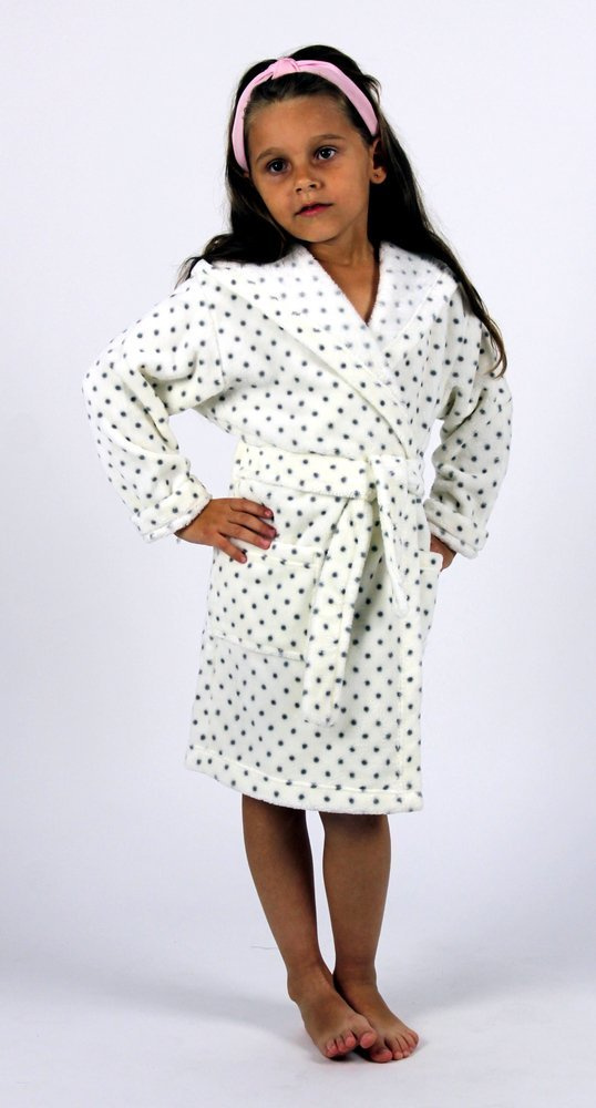 Детски халат FOREX с права кройка и качулка. Дължина до коляното, странични джобове, колан с връзка. Всичко в грах. Халатът за баня се адаптира перфектно към формата на тялото, изключително мек и лек, изработен от мека трикотажна материя. Да се увиете в него след къпане е удоволствие!