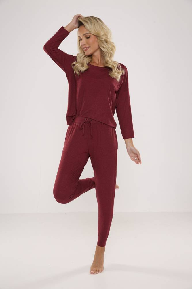 Дамска пижама от висококачествена вискоза с еластан. Суитшърт със 7/8 ръкава в свободна и удобна кройка. В комплект с дълги панталони с джобове. Колан с широка еластична лента, удобна подплата от вискоза. Крака, завършени с кант.