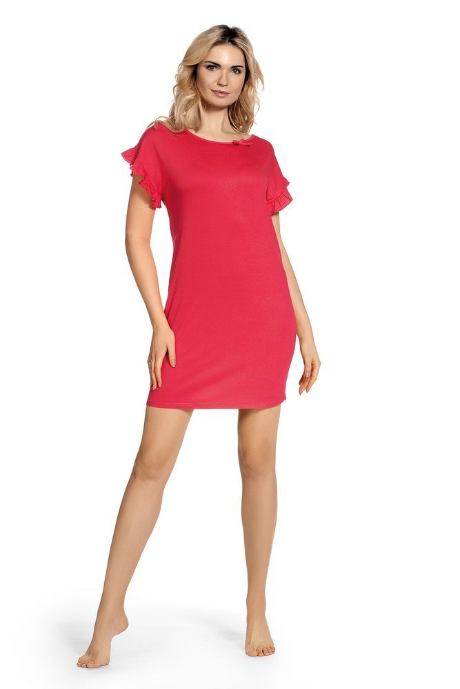 Деколте с форма на лодка, украсено с панделка. Ръкавите са украсени със забележителна къдричка. Дължина до коляното.