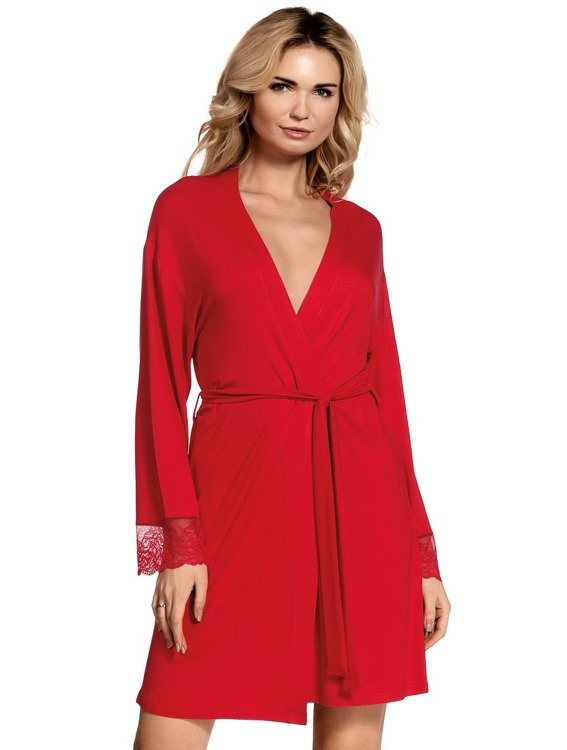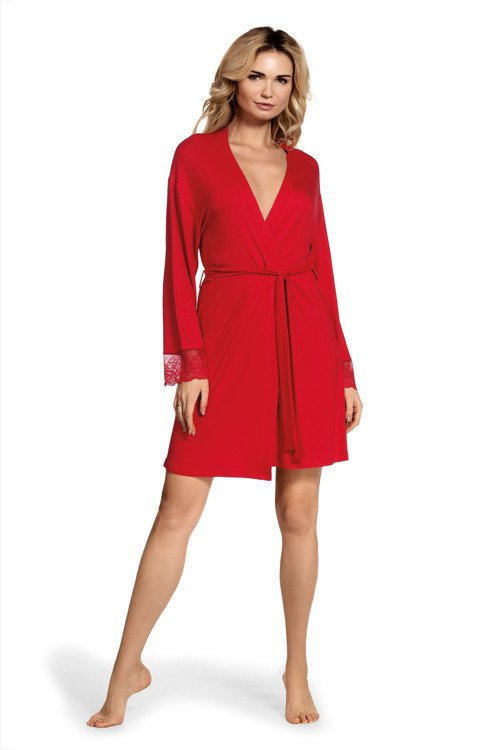 Дамски халат от висококачествена вискоза 94% с еластан. Къса, завързана на талията, с дълги ръкави. Маншети, завършващи с ажурна дантела.