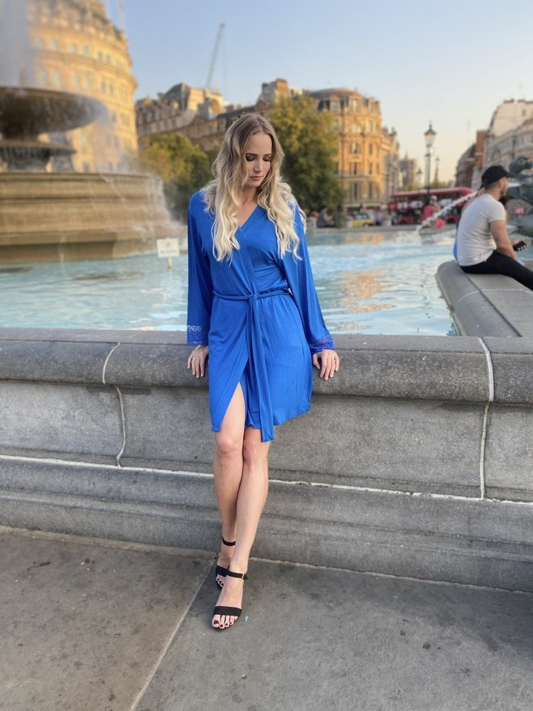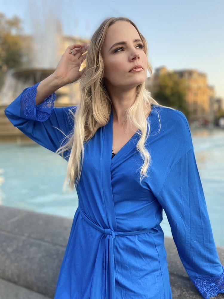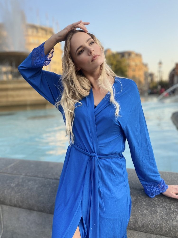 Дамски халат от висококачествена вискоза 94% с еластан. Къса, завързана на талията, с дълги ръкави. Маншети, завършващи с ажурна дантела.
