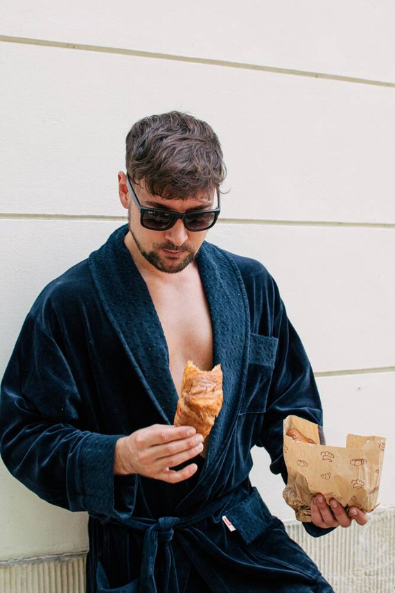 Дълъг мъжки халат от велур, с яка с шал, връзка с колан, с два джоба и един по-малък джоб на нивото на гърдите. Маншети, яка и джобове с релефен модел. Модел, изработен от 80% памук, приятен на допир, отлично абсорбиращ водата.