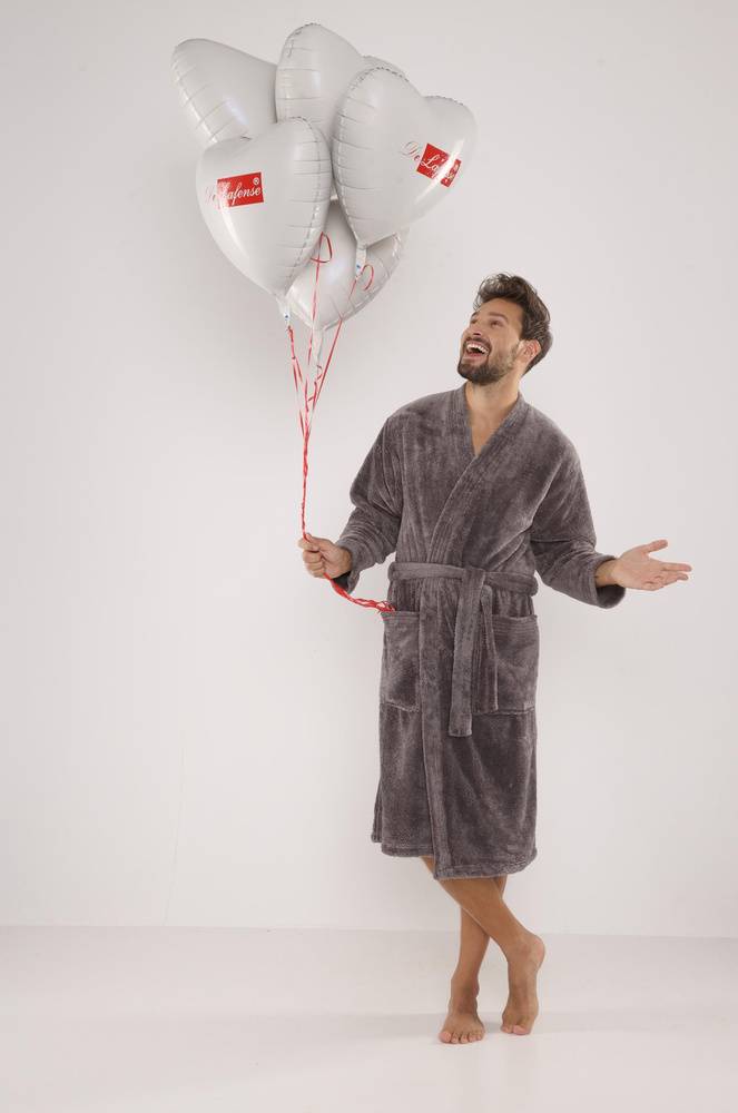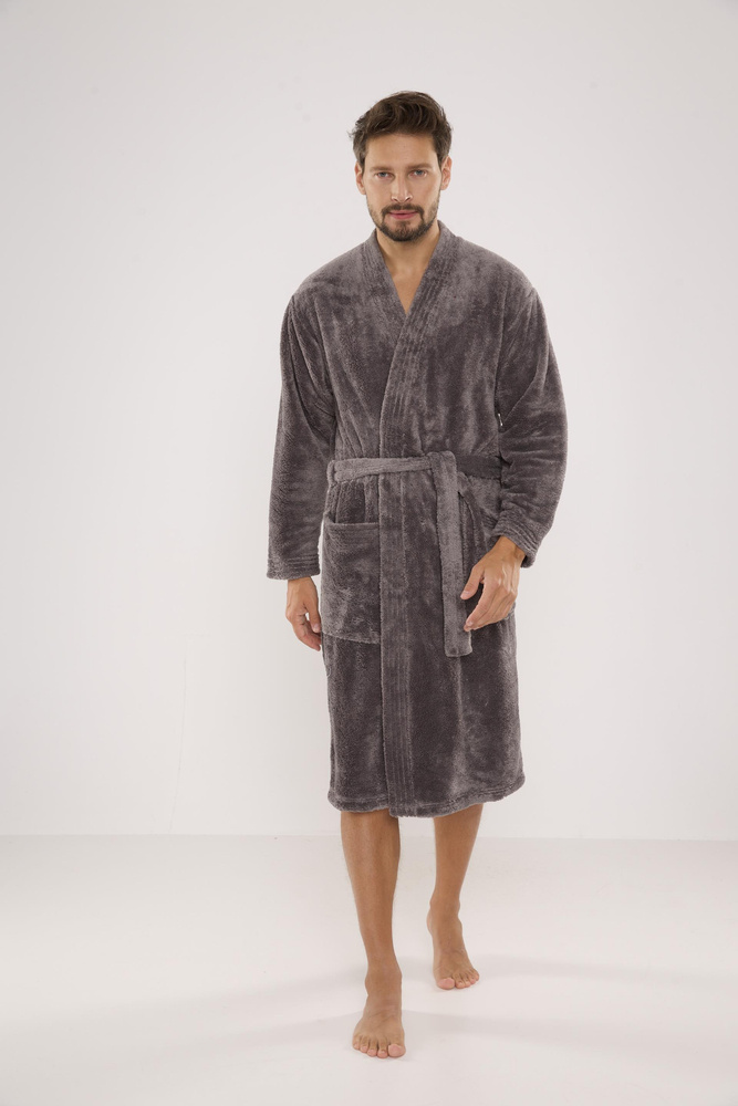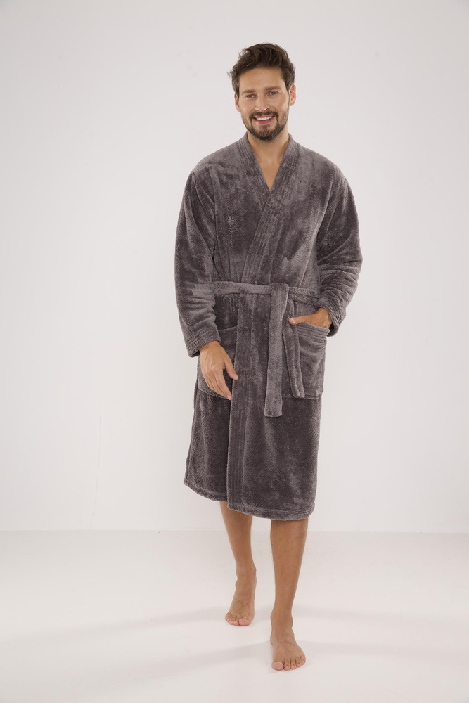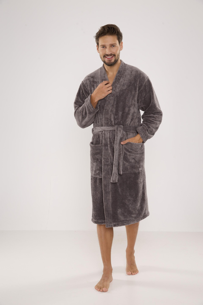 Мъжки дълъг халат от мека трикотажна материя. Връзка на талията, външни джобове на бедрата, пришита апликация на нивото на гърдите. Хубав и приятен на допир, гарантиращ комфорт при носене. Основното предимство на този модел е топлата и приятна на допир плюшена материя, която абсорбира отлично водата.