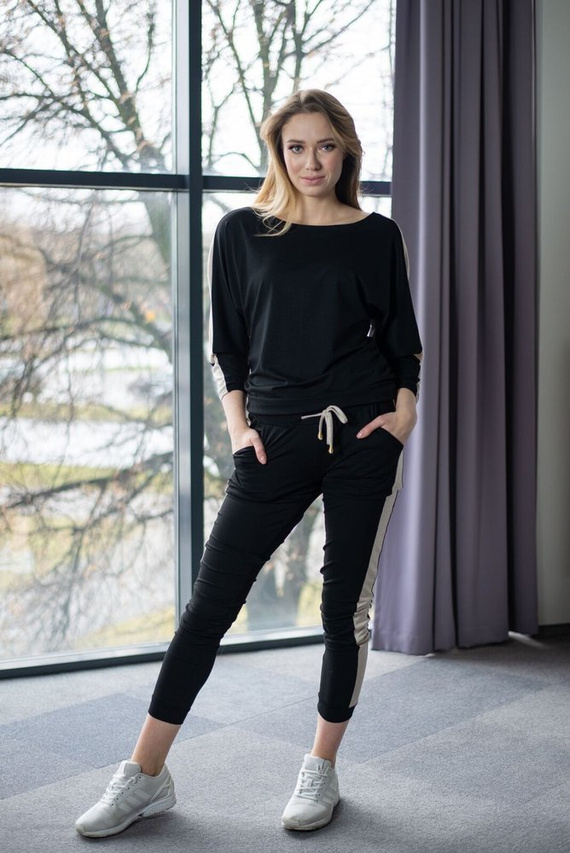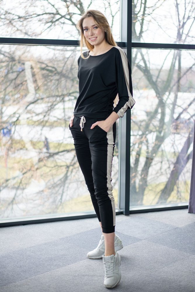 Komplet dresowy wykonany z wysokiej jakości dzianiny. Bluza i spodnie zostały wykończone  błyszczącymi lampasami oraz troczkiem co nadaje niecodzienny charakter pozornie zwykłemu dresowi. Marszczenie na boku bluzy pozwoli użytkować  komplet w trakcie ciąży ponieważ pomieści ona ciążowy brzuszek.
