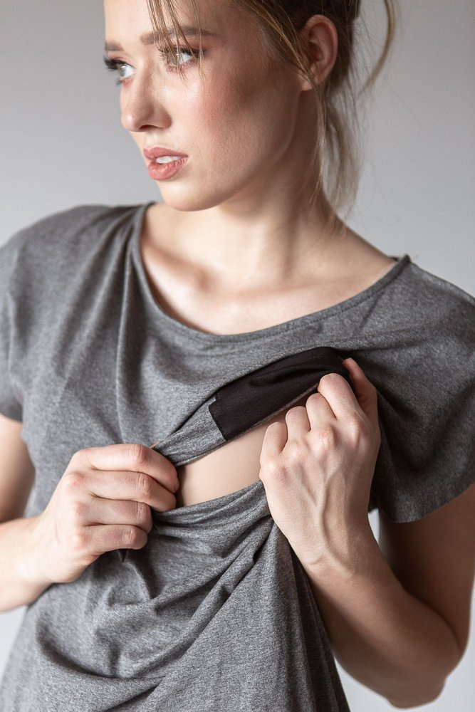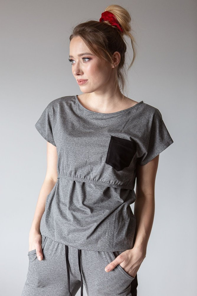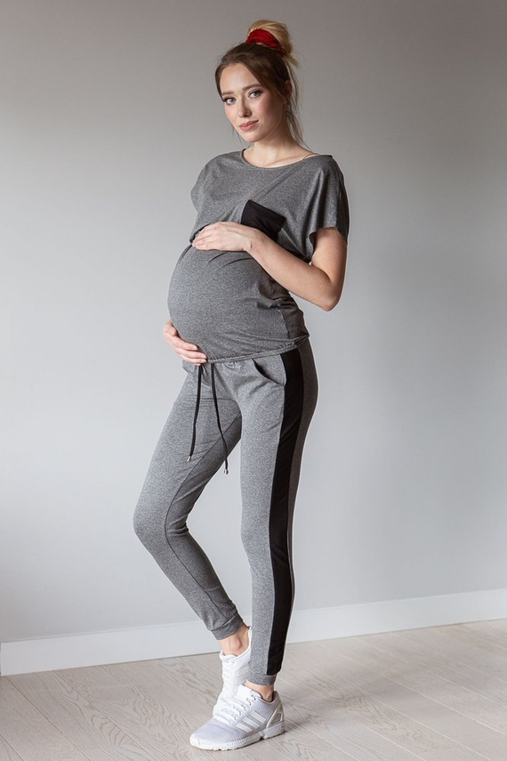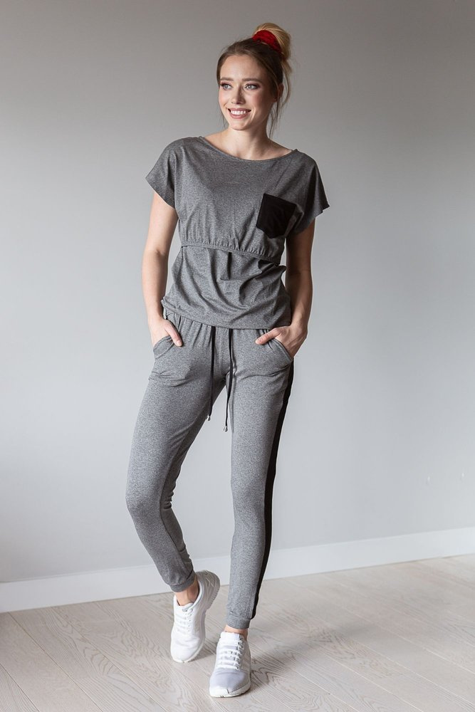 .Komplet dresowy z krótkim rękawem wykonany z wysokiej jakości dzianiny.Idealny zestaw dla przyszłych i obecnych mam. Klasyczny a jednak stworzony specjalnie z myślą o mamach komplet dresowy to połączenie wygodnych spodni z wysokim pasem z bluzą, która dzięki odciętej górze pozwoli wygodnie nakarmić malucha.