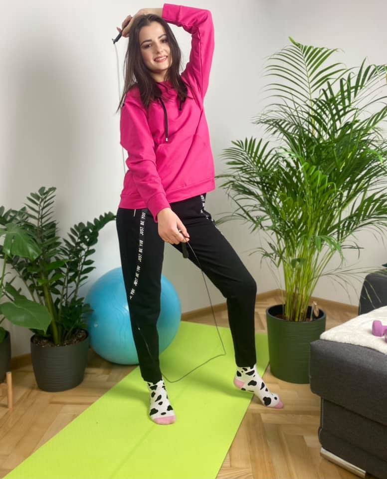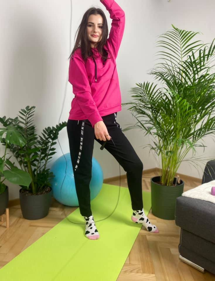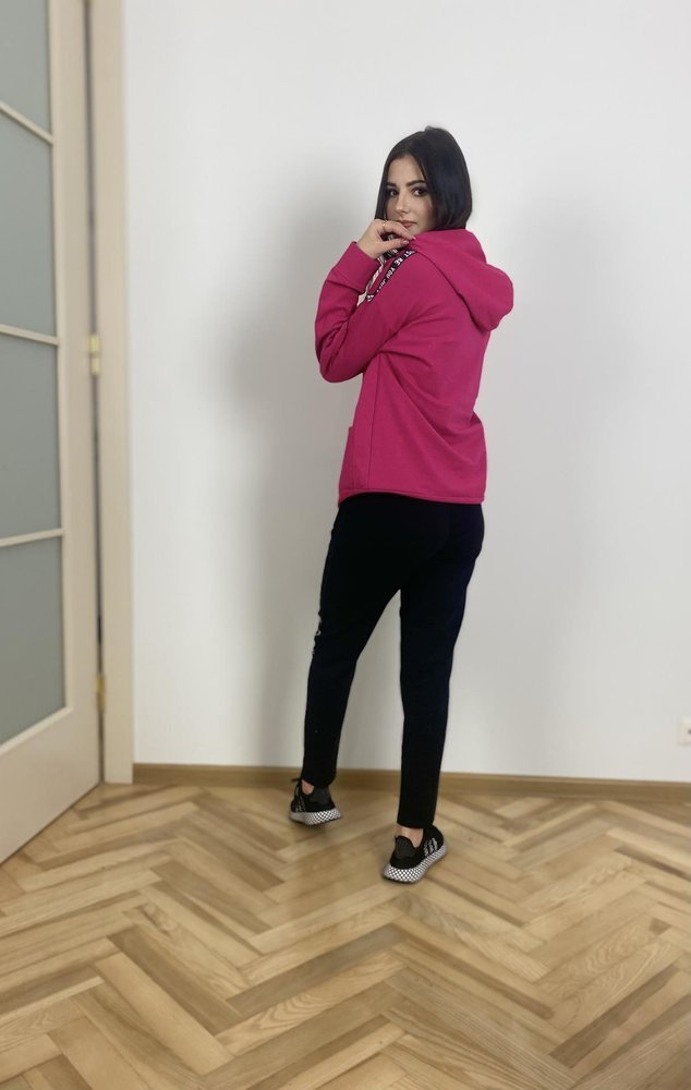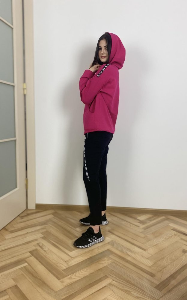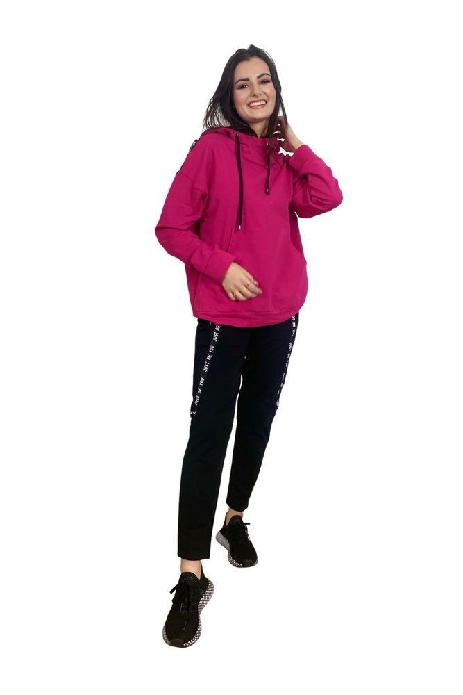 Удобен дамски спортен костюм от приятна за тялото материя. Суитшърт с дълъг ръкав и качулка. На нивото на корема, джоб. Панталони с джобове. Колан, завършващ с шнур за пристягане. Ръкави и крачоли с надпис.