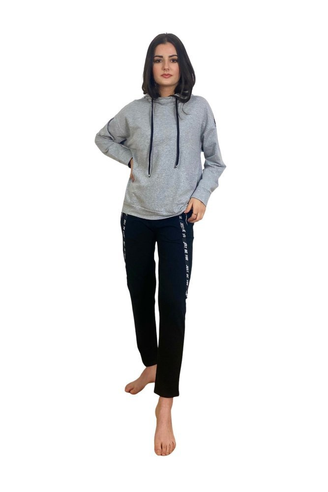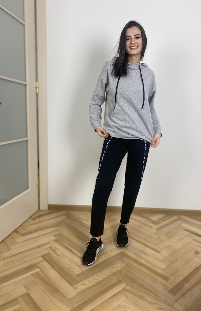 Удобен дамски спортен костюм от приятна за тялото материя. Суитшърт с дълъг ръкав и качулка. На нивото на корема, джоб. Панталони с джобове. Колан, завършващ с шнур за пристягане. Ръкави и крачоли с надпис.
