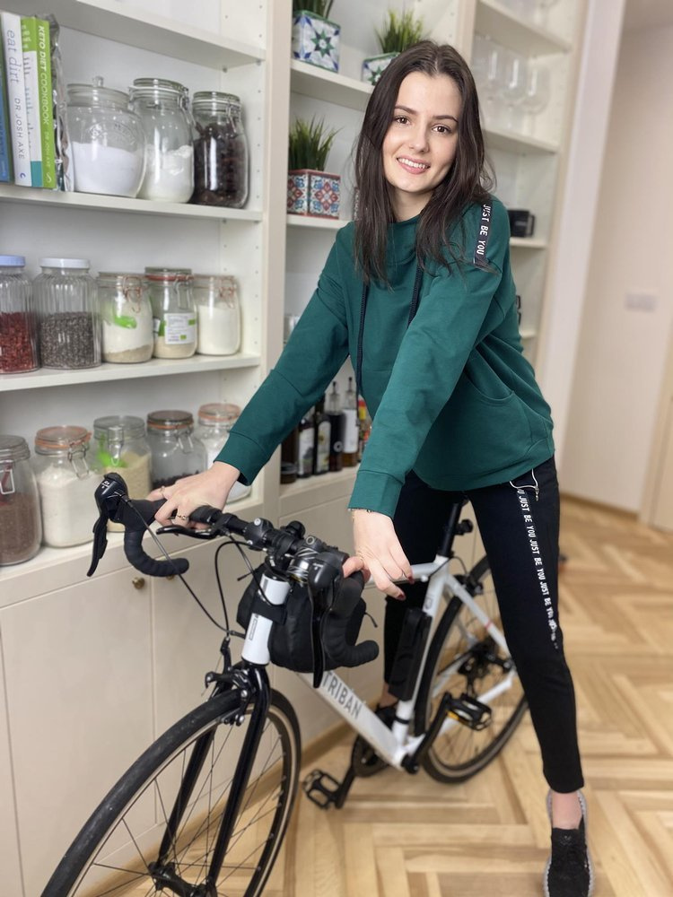 Удобен дамски спортен костюм от приятна за тялото материя. Суитшърт с дълъг ръкав и качулка. На нивото на корема, джоб. Панталони с джобове. Колан, завършващ с шнур за пристягане. Ръкави и крачоли с надпис.