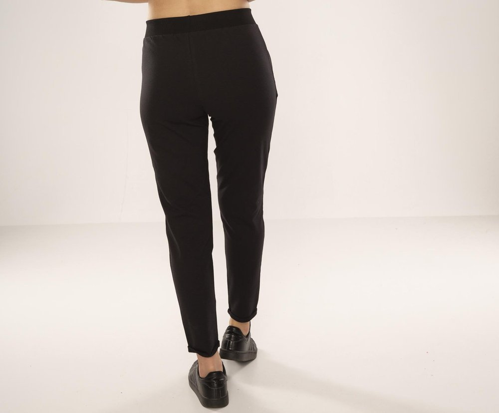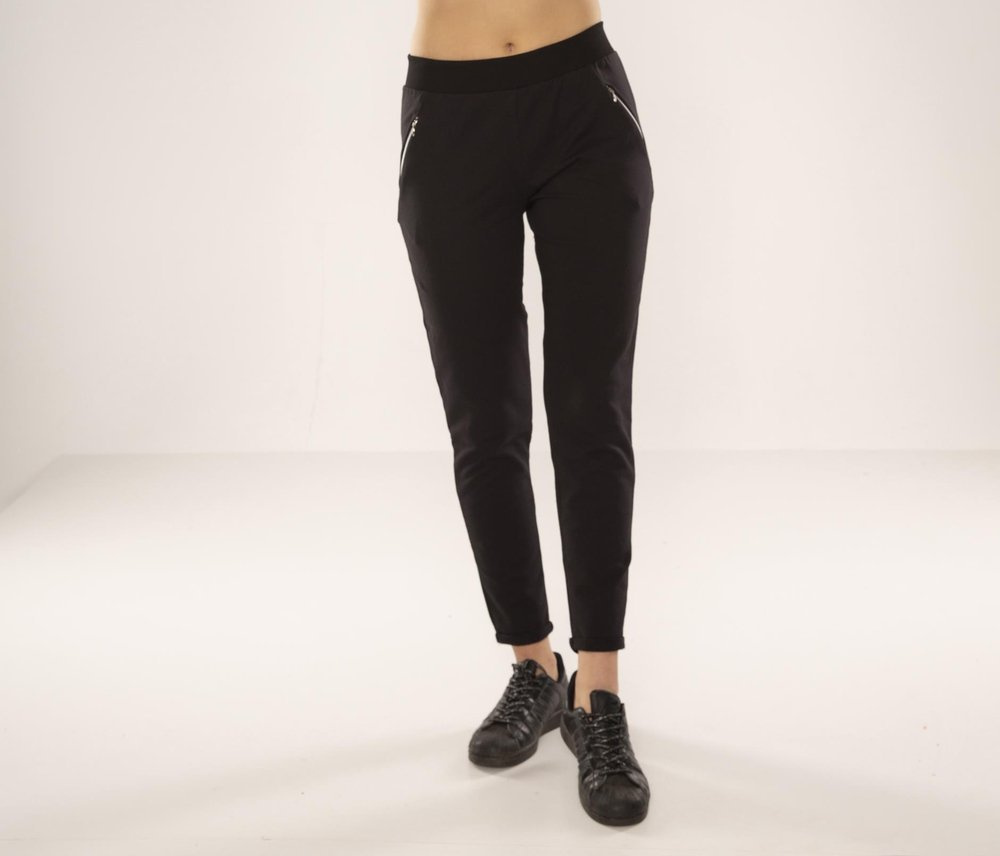 Потници от висококачествен памук. Удобна талия с шнур. Джобове с цип на нивото на бедрата. Леко заострени крачоли, завършващи с малък маншет.