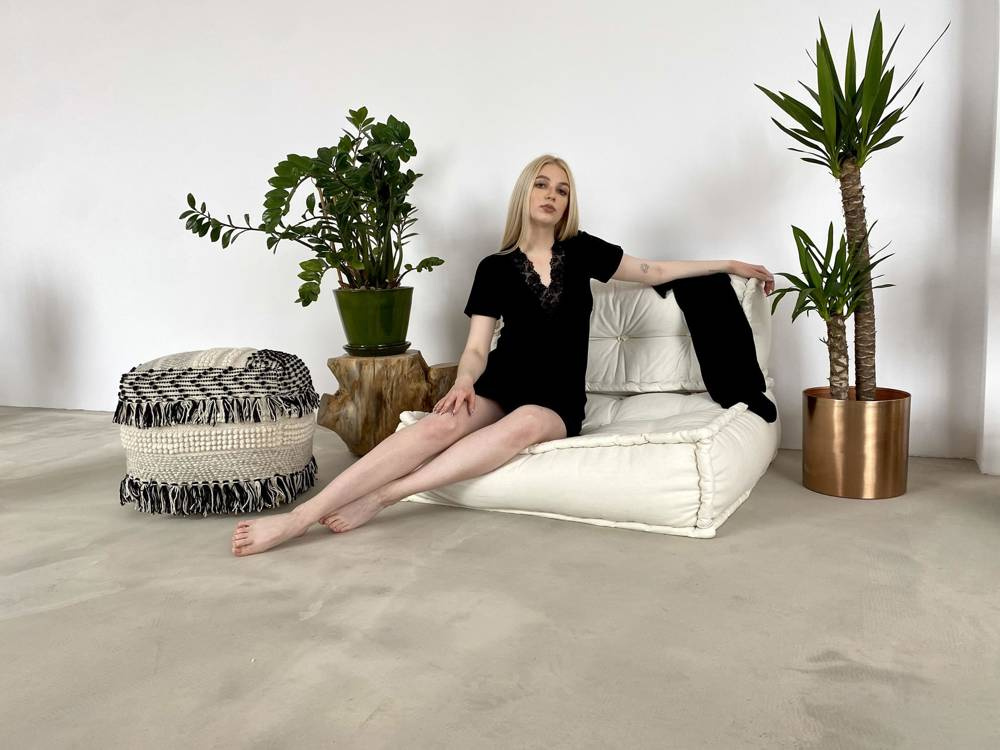 Дамска риза от висококачествена вискоза, с къс ръкав. V-образно деколте, маншети с широка флорална дантела. Дължина до коляното. Всяка жена ще се почувства специална в него !!