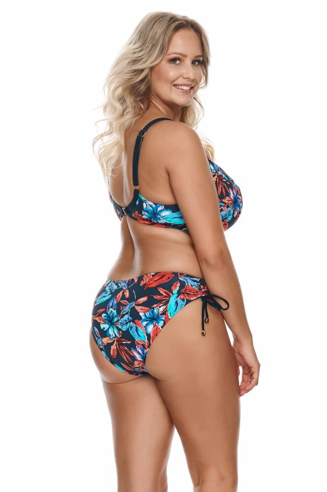 Костюм за плуване в красиви, ярки цветове. Мек плетен сутиен, украсен с флорален мотив. Благодарение на моделиращите кройки и подлепването той поддържа перфектно бюста. Регулируеми, несменяеми презрамки. Широчина на каишката и вид на закопчалката, съобразени с размера на банския костюм. Деликатна украса между чашите придава чар на цялото изделие. Идеален за дами с по-пълна форма.
