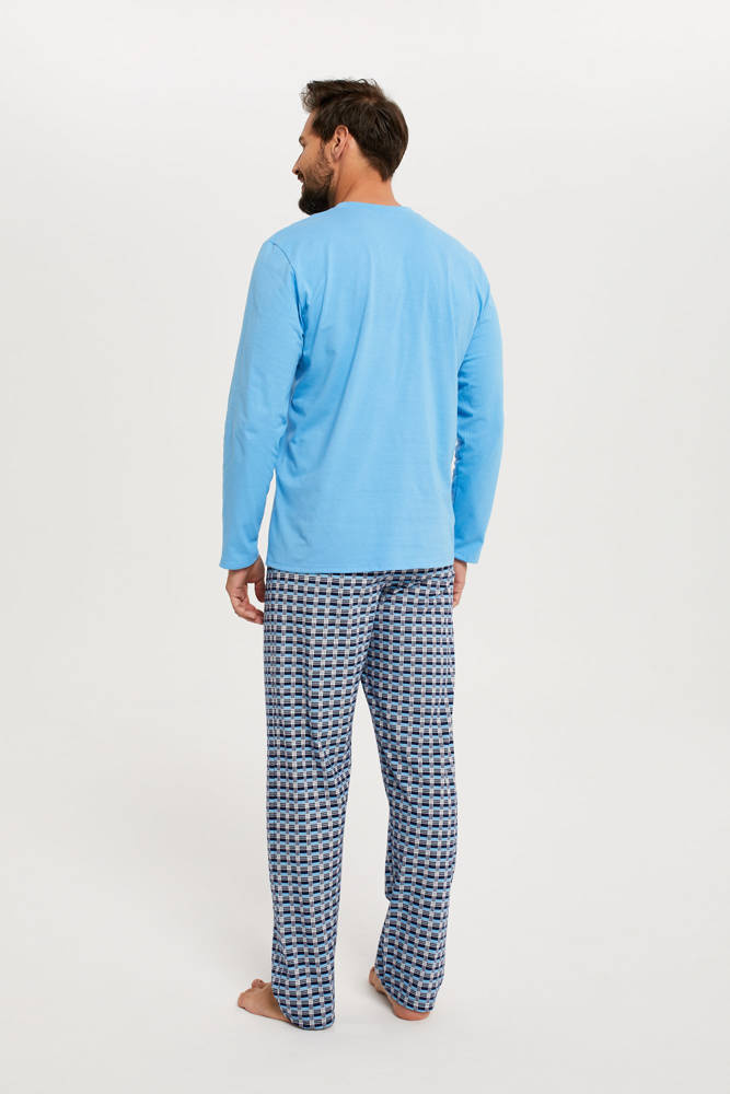Мъжка пижама във вечна, класическа кройка. Внимателната изработка и вниманието към детайлите правят продукта издръжлив и ще изпълнява функциите си в продължение на много години. Пижама с дълъг ръкав и джоб на гърдите, подчертан от деликатна шарена вложка, от същата материя като панталона, ще добави елегантен и шикозен щрих по своя прост и невидим начин. Допълнителен бонус е V-образното деколте, завършено за комфорт и удобство.