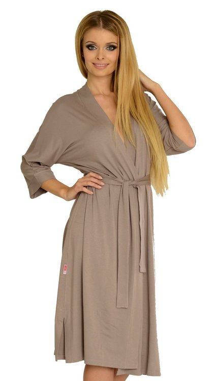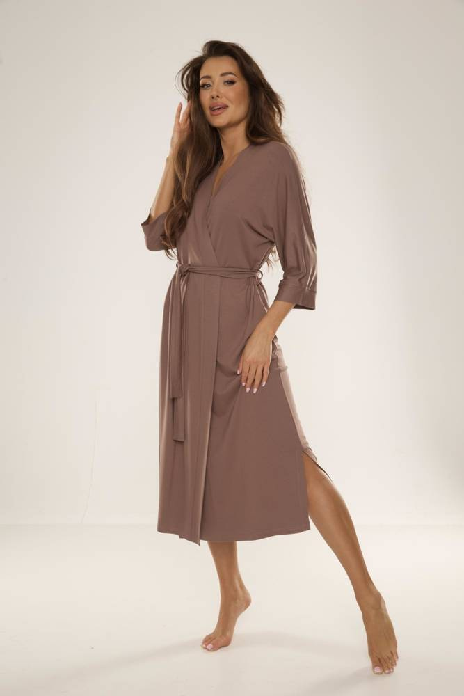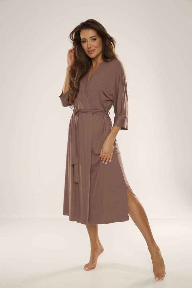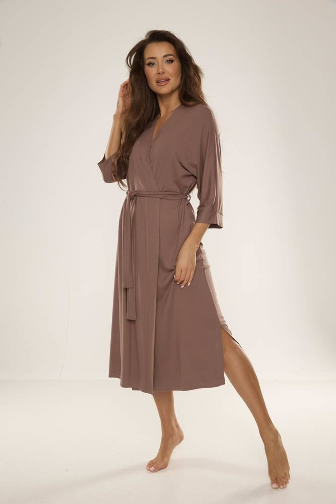 • Елегантен дамски халат 942 Visa на De Lafense, изработен от висококачествена вискоза. Дълга кройка, 3/4 ръкав и колан създават женствен и класически вид.