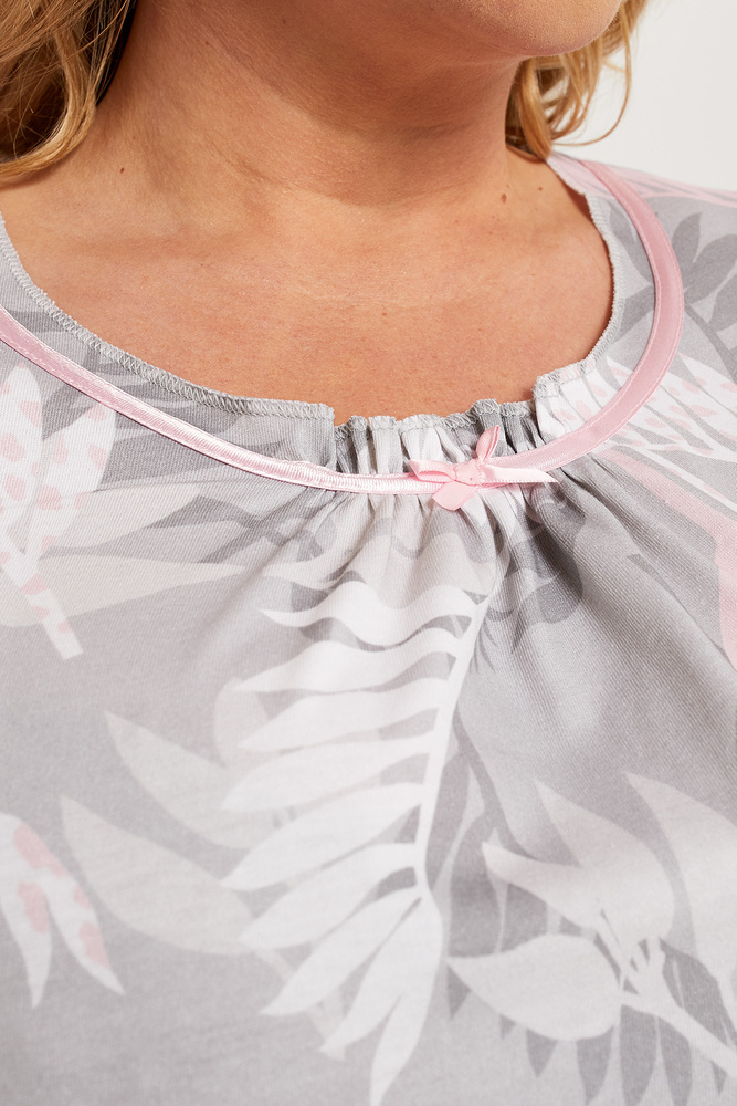 Красивата и изтънчена дамска пижама Bartonia е издържана в меки пастелни цветове. Блузата е изработена от плат, покрит с приглушен и мек десен на сиво-розови листа на сив фон. Кръглото деколте е обточено с розова панделка и украсено с панделка в същия цвят. Панталонът за пижама е с права кройка, висок ръст и удобен ластик без натиск.