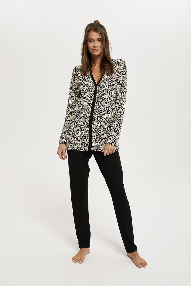 Красиво и изтънчено предложение за жени за предстоящия есенно-зимен сезон. Дамската пижама Abisynia е комбинация от разкопчана блуза с дълъг ръкав и обикновен черен панталон с прав крачол. Тя е изключително функционална и практична благодарение на копчетата по цялата дължина на блузата.