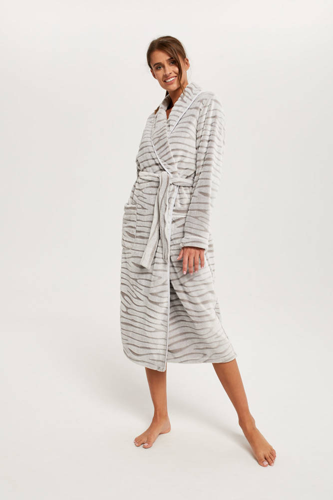 Мек и приятен на допир, халатът за баня Asma е идеален за есента и зимата. Меката и пухкава тъкан е двуполюсна, с отлична топлоизолация, гарантираща топлина и комфорт. Силната животинска щампа се съчетава чудесно с нежната сива цветова гама, като придава на цялото изделие уникален характер. . Допълнително предимство е практичното връзване на талията и функционалните джобове.