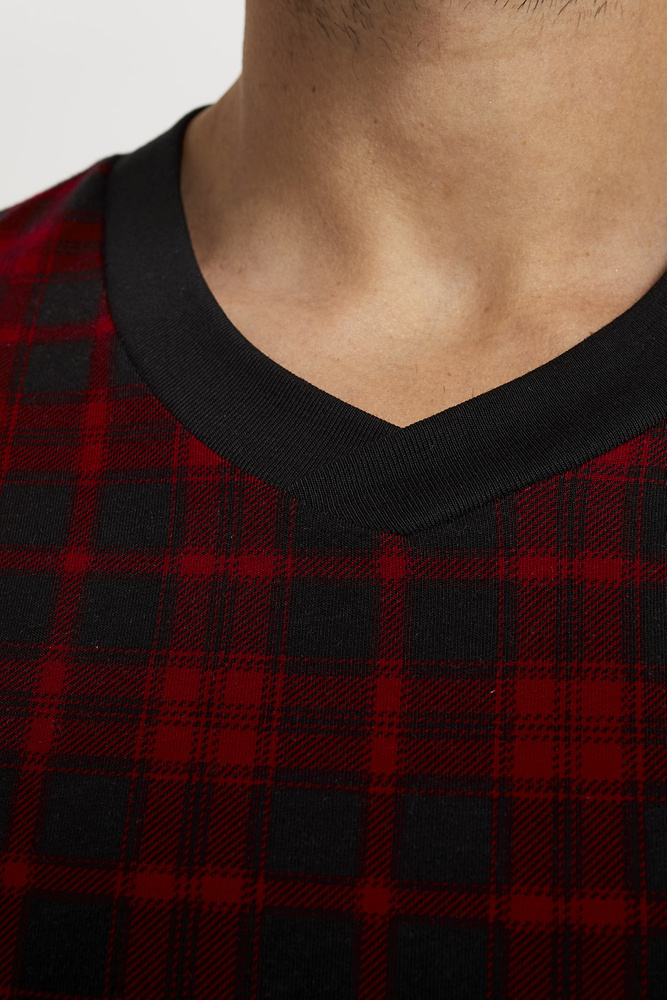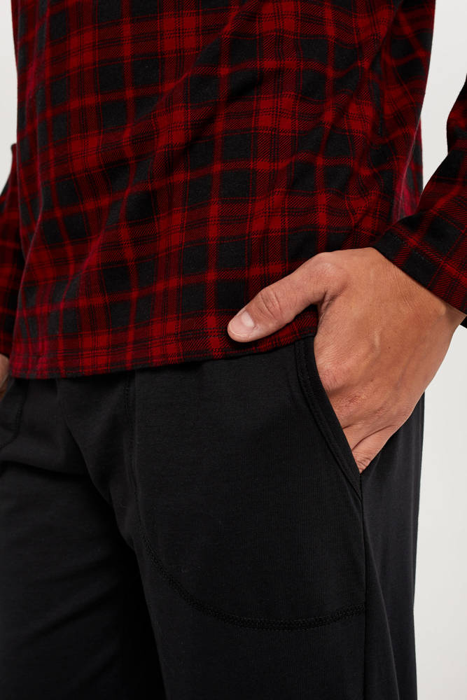 Завладяващата мъжка пижама Eliasz е проектирана и ушита в шивашка работилница близо до Варшава, като се полагат грижи за осигуряване на най-високо качество на изработката. Използването на 100% памучни материали осигурява високо ниво на комфорт и гарантира, че продуктът ще ви радва и служи безупречно дълги години. Интересната комбинация от обикновени черни панталони с прав крачол се съчетава добре с блуза с дълъг ръкав от вечната червено-черна карирана материя. V-образно деколте, обшито с контрастен черен кант, чудесно подчертава елегантния характер на пижамата.