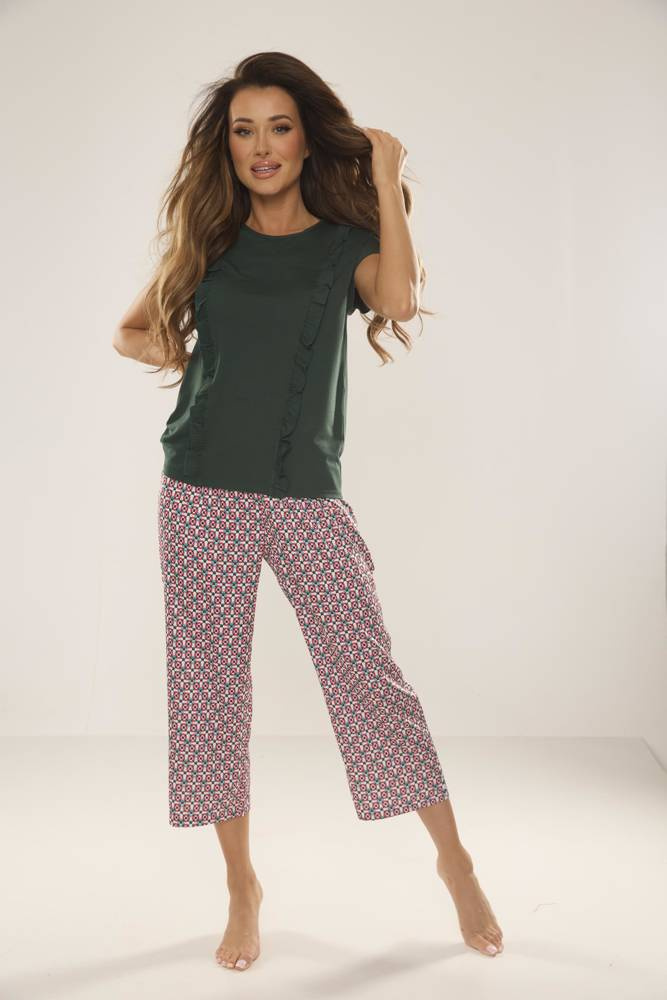 Пижама от две части на De lafense, изработена от висококачествена вискоза. Идеален за добър сън през нощта и чудесно начало на деня с първото сутрешно кафе. Тениска с къс ръкав. Къси панталони с шарки, кюлоти, 3/4 дължина.