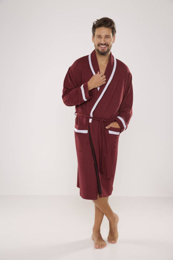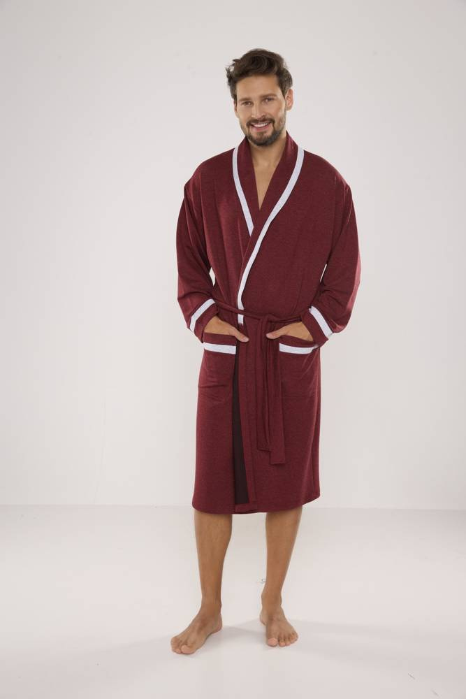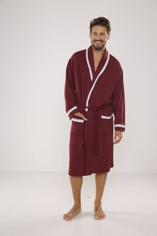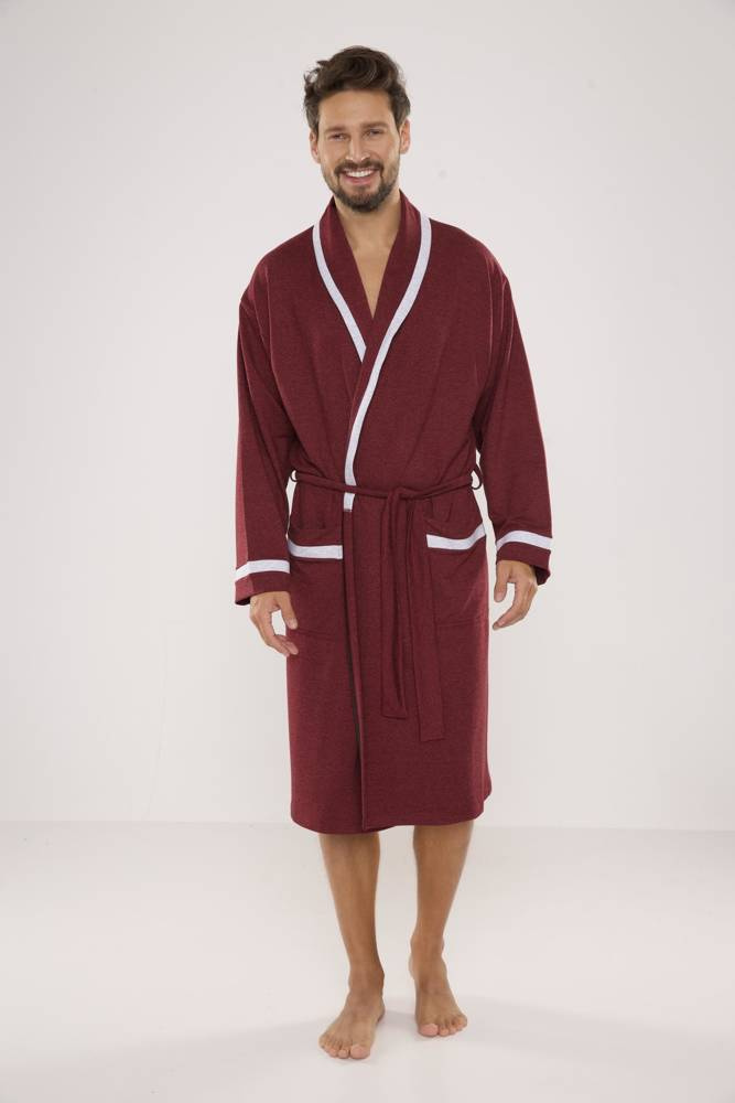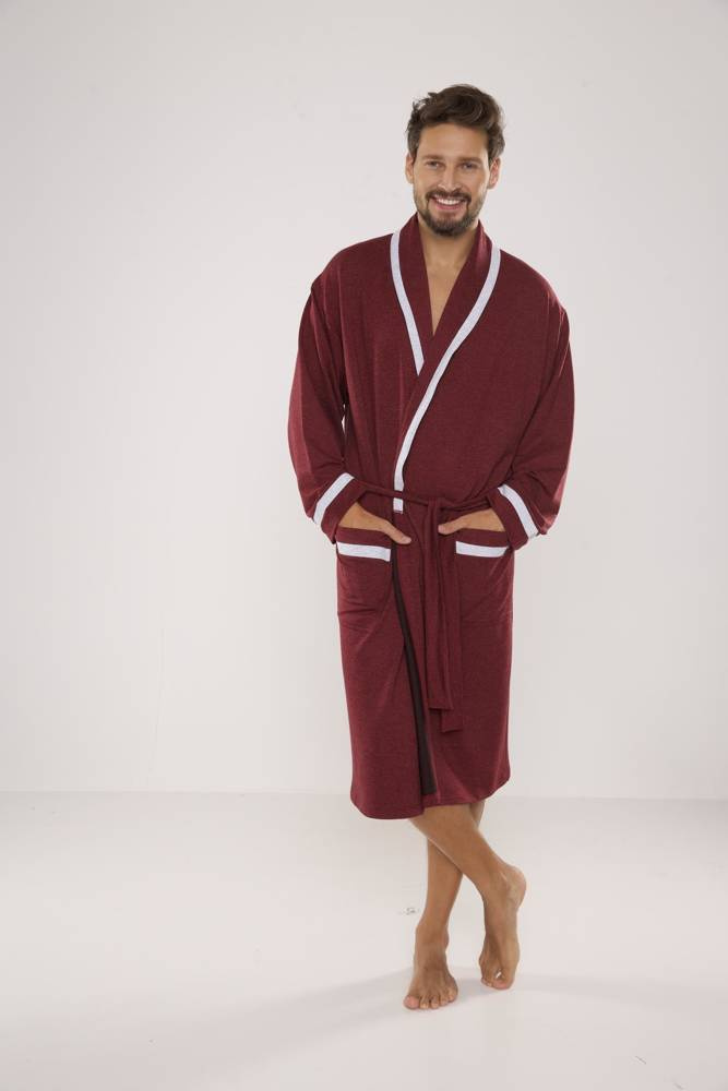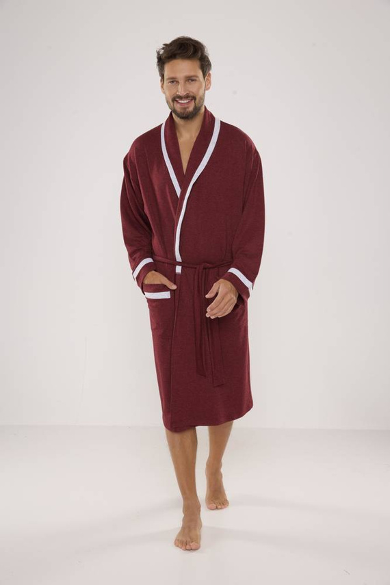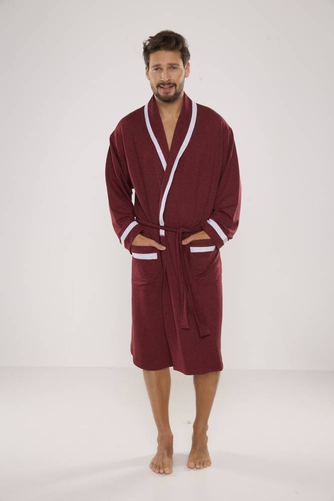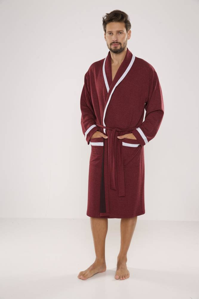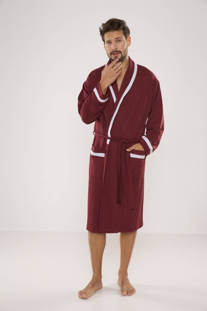 Предлагаме ексклузивен дълъг халат за баня с яка, завързан на талията.