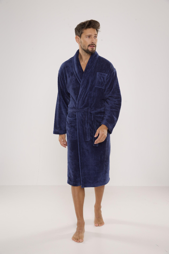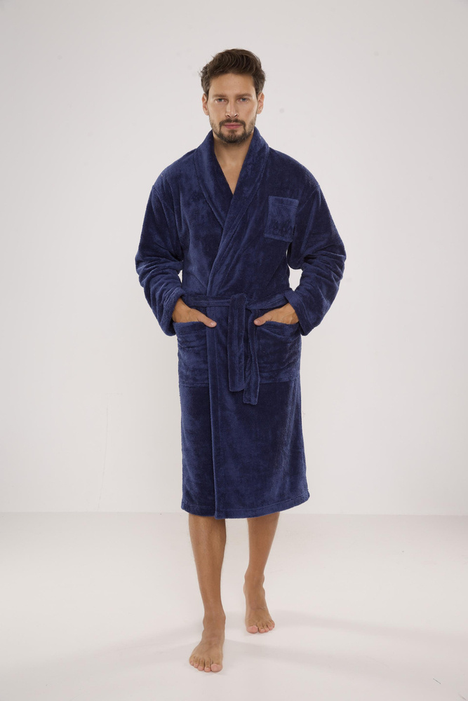 Елегантен, много удобен мъжки халат за баня. Изработен от топла, мека и приятна на допир плюшена плетка. Класическата кройка стои чудесно на фигурата. Моделът има два практични джоба и връзка на талията.